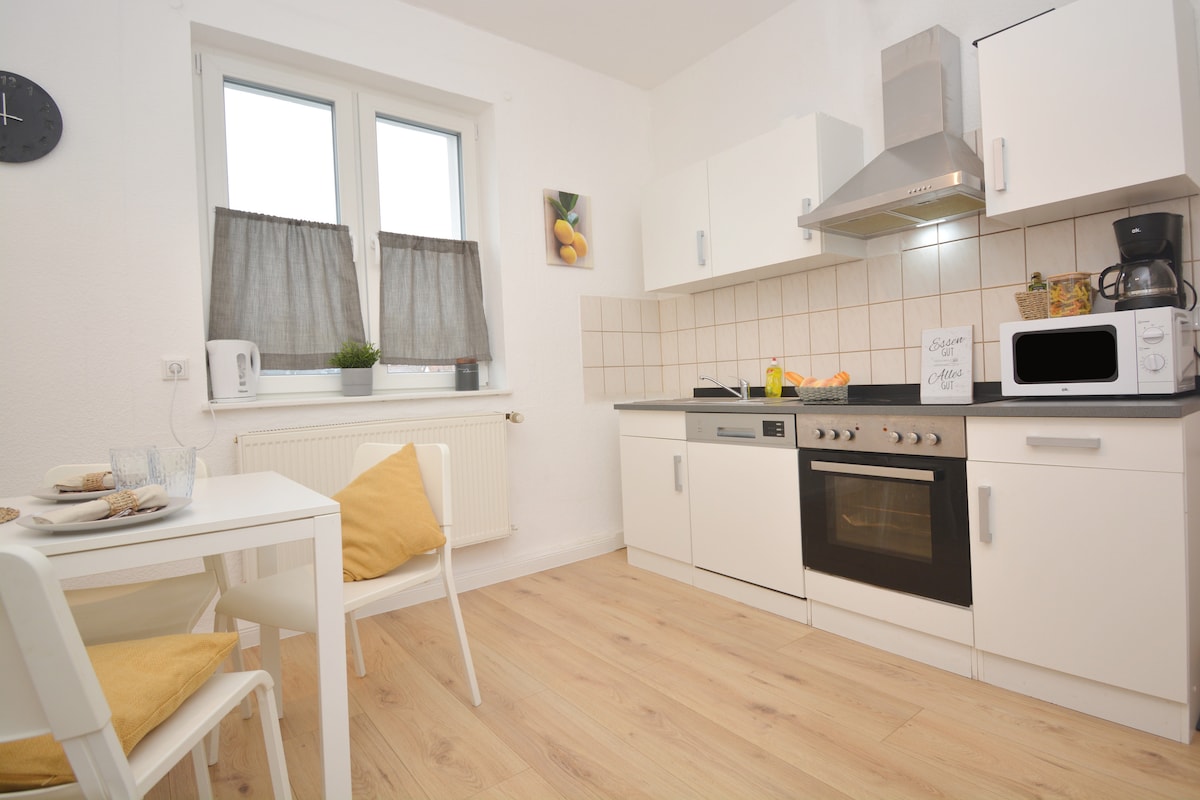 Te damos la bienvenida a nuestro espacioso y tranquilo apartamento de 90 metros cuadrados en una casa de dos familias. Aquí se pueden alojar hasta 4 personas. Incluso en verano alto, es agradable tolerarlo con persianas exteriores. Amplia cocina con mesa de comedor y cuatro sillas, baño con ducha e inodoro, sala de estar con chimenea de leña y TV, balcón con mesa y sillas, un dormitorio con cama de 180*200, el segundo dormitorio con una cama de 90*200 y una cama extraíble de 140*200. Se puede utilizar un garaje compartido para guardar bicicletas