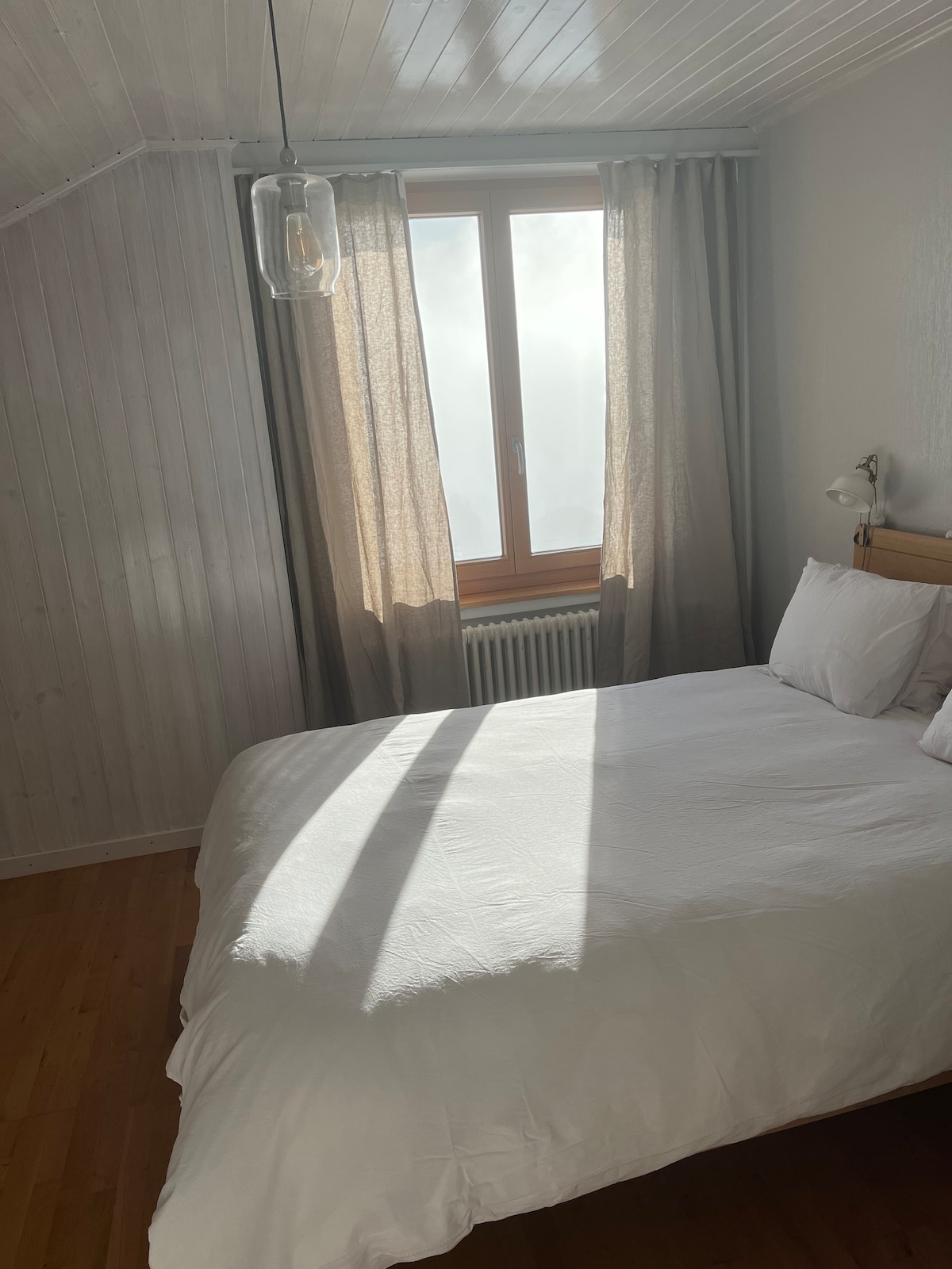 Bequeme 2-Zimmerwohnung mit viel Atmosphäre und einer phänomenalen Aussicht auf die Alpen. Ca. 10 Fussminuten von der S-Bahnstation entfernt. Zentrum von Bern mit dem Zug in 15 Minuten zu erreichen. Schönes Erholungsgebiet direkt ab Haustüre. Für Spaziergänger, Läufer, Biker, Flussschwimmer oder Inline-Skater ein Eldorado. Wohnung befindet sich im Dachstock mit Lift erschlossen. Parkplatz vor der Haustüre. Gastgeber wohnen im Haus und stehen gerne mit Rat und Tat zur Verfügung.