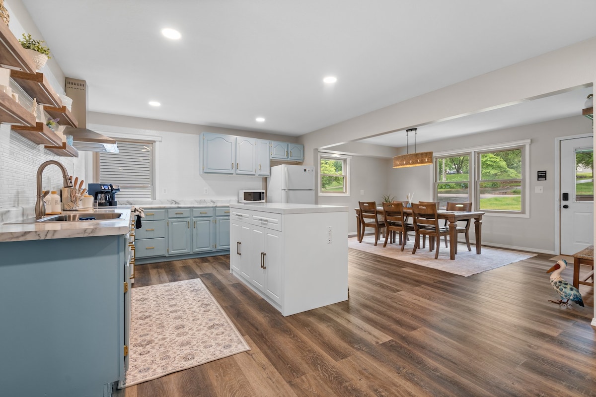Salón de concepto abierto con muchas actualizaciones. Cocina totalmente abastecida y equipada y lavandería en la planta principal. El dormitorio principal del primer piso y el baño completo son ideales para personas con movilidad reducida. Habitación Four Seasons con hermosas vistas al lago. Espacio de muelle, chimenea y muchos extras de lago incluidos.