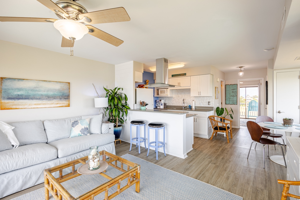 This beautiful 1 Bedroom 1.5 Bath Condo, offers you a relaxing retreat, an opportunity to see the sunrise, the ocean & listen to the soothing ocean waves from the bedroom. The master bedroom has a queen bed, & the sofa in the living room provides you with a pullout queen sleeper sofa, this condo will sleep four adults comfortably. You will only be steps away from the North End Pier, and a short bike ride to the boardwalk. We hope you enjoy your stay with us at The Gathering Place.