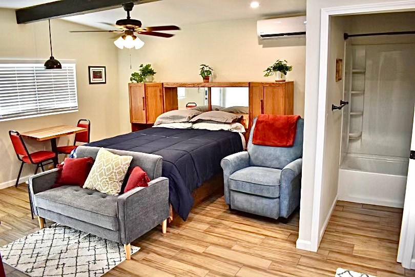 Adorable casa de huéspedes de adobe con un atractivo techo revestido de madera natural. Dormitorio espacioso, amplio y acogedor salón. Cocina completa, triturador de basura, cafetera, nevera, horno, estufa. Cuarto de la colada compartido con medio baño. Internet por cable: 367 Mbps de bajada, 11,9 de subida. Tranquilo. Acre vallado y cercado con majestuosos robles y cítricos, gimnasio en casa: pesas debajo de la zona de picnic. Amplio mobiliario de patio alrededor de la propiedad, casa de juegos para niños. Aparcamiento reservado para huéspedes; entrada privada. Vallado, cerrado para dar la bienvenida a las mascotas.