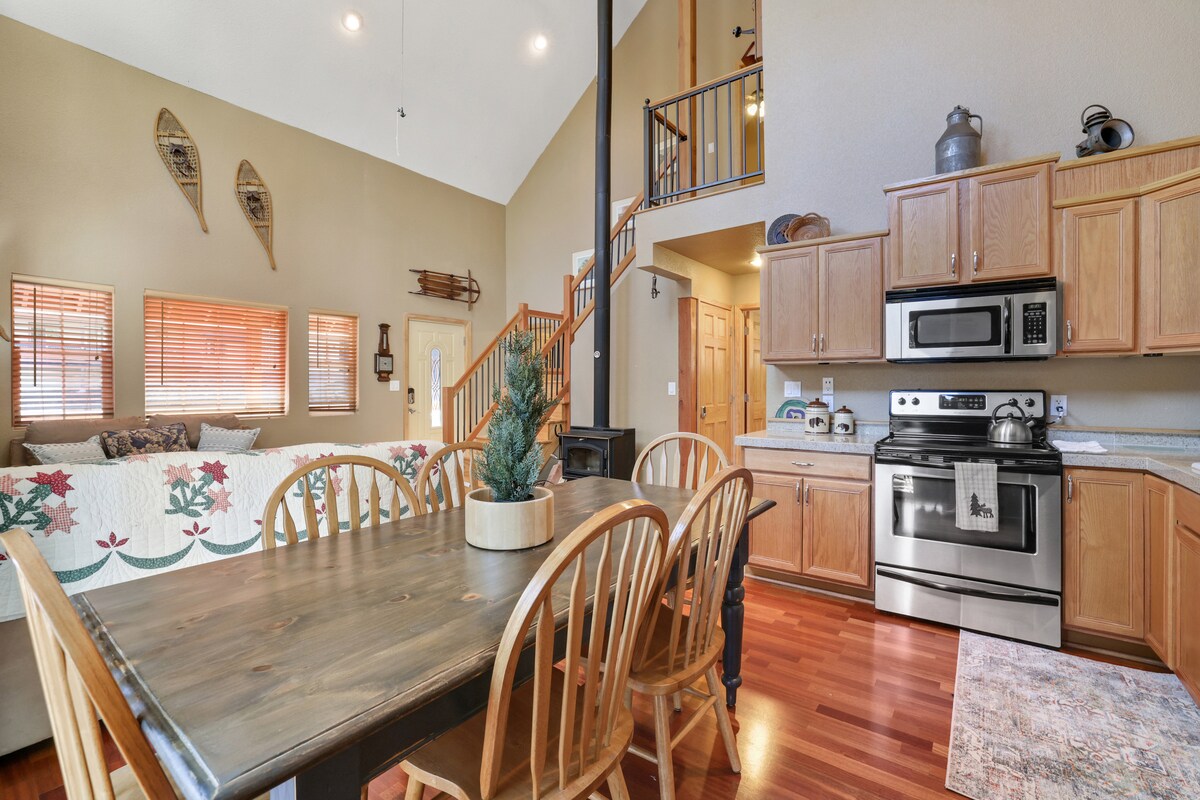 Observa los fuegos artificiales desde las cubiertas de esta hermosa casa que está encaramada en la cima de una colina, tiene impresionantes vistas del lago y las montañas. Este alojamiento tiene 4 dormitorios y 3 baños y tiene capacidad para 17 personas. Hay una cocina totalmente equipada con hornos dobles para todas tus necesidades culinarias. Hay un montón de juegos/videos para que la familia haga juntos. Sombra a los ciervos con vistas a todo desde su montura en la chimenea de piedra en la sala de estar.