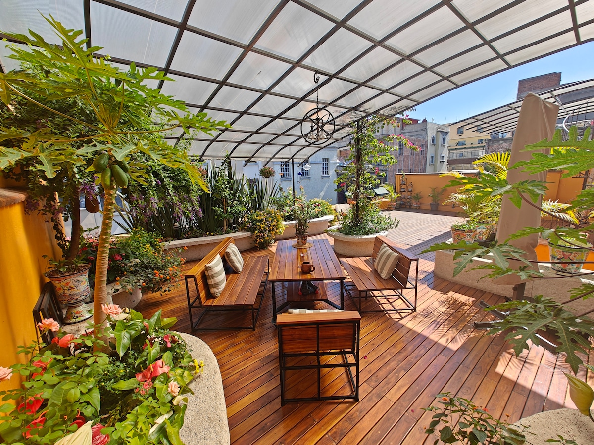Jardín de tradiciones, ubicado en un edificio porfiriano en Roma N, decorado con referencias a tradiciones méxicanas. Cuenta con: baño espacioso y equipado; lavadora estratégicamente ubicada; cocina equipada con parrilla, microondas, y refrigerador; comedor con mesa y sillas para cuatro personas; Sala de estar con sofá y sillas para relajarse. Habitación principal con cama king-size, ropero, TV y aire acondicionado. Acceso al jardín desde la sala y la recámara. Ideal para estancias prolongadas.