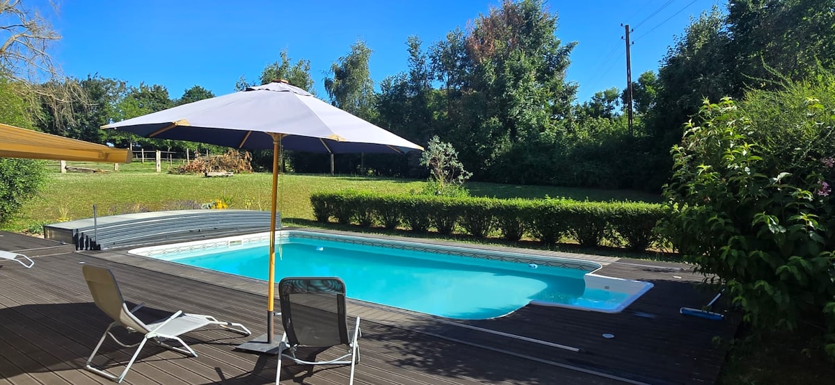 Installez-vous dans notre maison d'amis (cour commune avec notre habitation) pour vous reposer et profiter des plaisirs de la campagne. Accès piscine uniquement sur réservation d'un créneau horaire convenu ensemble. Table de ping-pong et jeu de boules à dispo. Possibilité de commander, moyennant surcoût, des en-cas d'arrivée, des petits déjeuners, des planches apéro...
