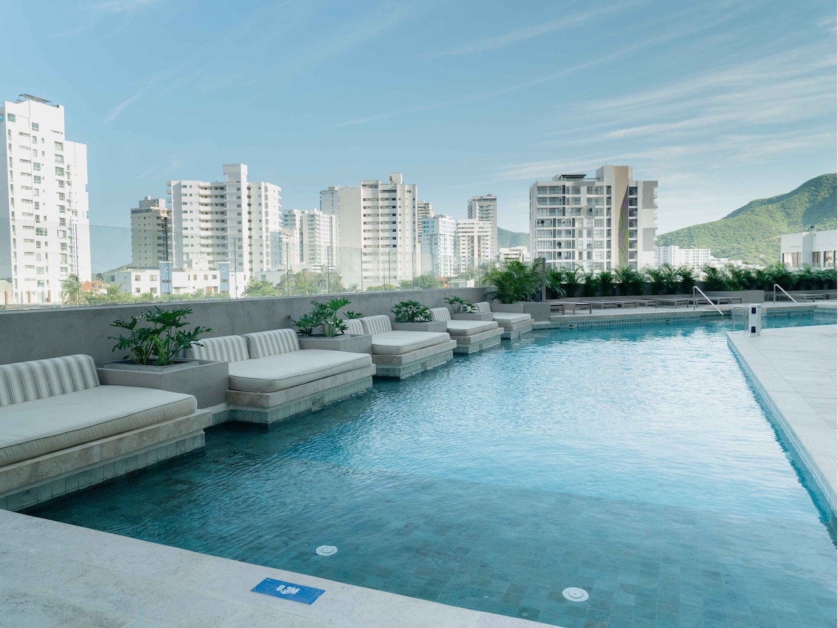 Disfruta inolvidables momentos Santa Marta. Hermoso Apartamento, salida directa al mar, excelentes amenidades piscinas, jacuzzis, gym, senderos naturales, solárium y zonas infantiles. 2 habitaciones y un espacio privado con sofá cama o estudio, 2 baños con ducha, cocina dotada, calentador, lavadora y secadoras. Vista infinita al Mar y la Sierra desde nuestro balcón Piso 19 disfrutaras atardeceres mágicos, acceso directo a piscinas, jacuzzis, zona infantil. Accesible a movilidad reducida.