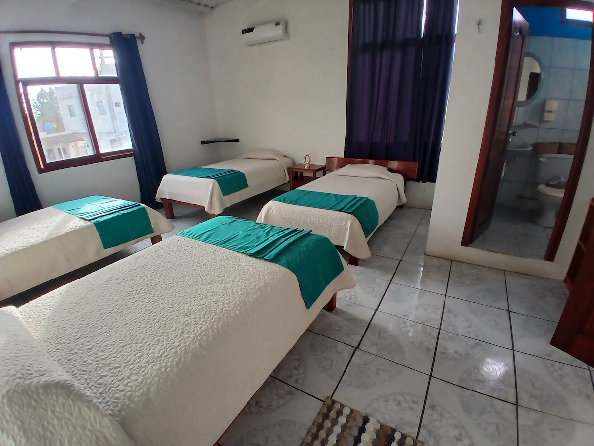 Habitación en segunda planta. La habitación cuenta con 2 camas Queen, aire acondicionado, baño privado con agua caliente y secador de cabello. Disfruta de nuestra piscina luego de tus actividades turísticas. Te brindamos agua filtrada, te y café Galapagueño free 24 horas, disponible cundo lo necesites. Nuestras tarifas no incluyen 15% IVA, por favor si eres de ECUADOR y requieres Factura comunícate con nosotros antes de confirmar tu reserva.