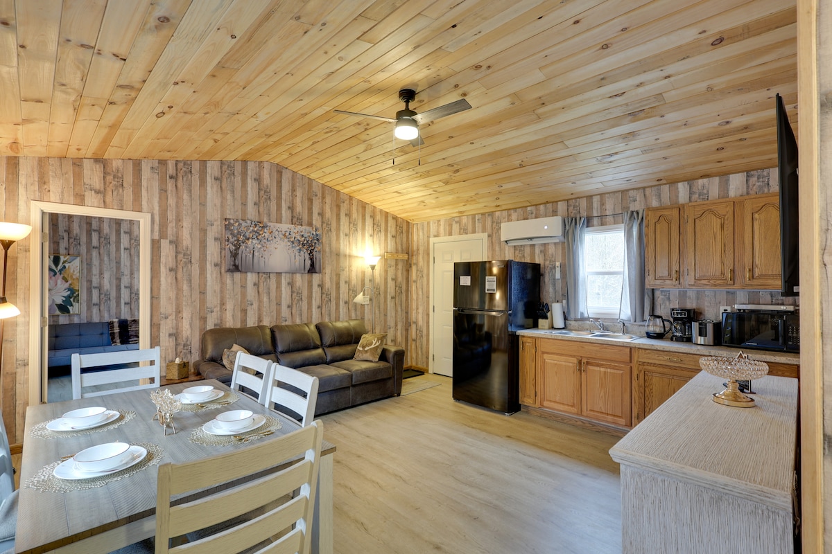 Ubicada en los árboles sobre el agua, la cabaña Overlook ofrece una experiencia tranquila, cómoda e íntima del río Ohio, con una gran ventana frente al río, terraza de 8x12 pies y bañera de hidromasaje. El espacio de 12x40 pies tiene una cama tamaño queen, 2 camas individuales, otra cama en el loft y un sofá, y sería ideal para familias, cazadores o parejas. Se proporciona café local. Los propietarios viven en el lugar en caso de que surja algún problema. Se admiten mascotas. Wifi gratuito disponible.