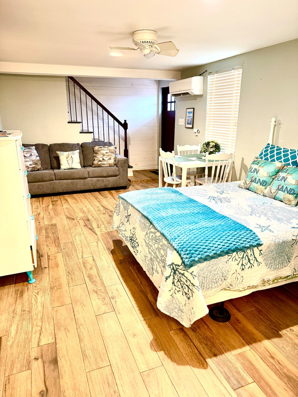 Check yourself into this lovely guest suite featuring a private entrance and off street parking. Centrally located just 3 miles from the cruise ship terminals, 4 miles from Moody Gardens, and a 10 minute walk to the beach! The suite is an addition to a well maintained craftsman bungalow in a residential neighborhood. It features quality solid wood furnishings, stylish decor, and several amenities including coffee maker w/coffee supplies, microwave, hair dryer, smart TV, dishes, and seating.