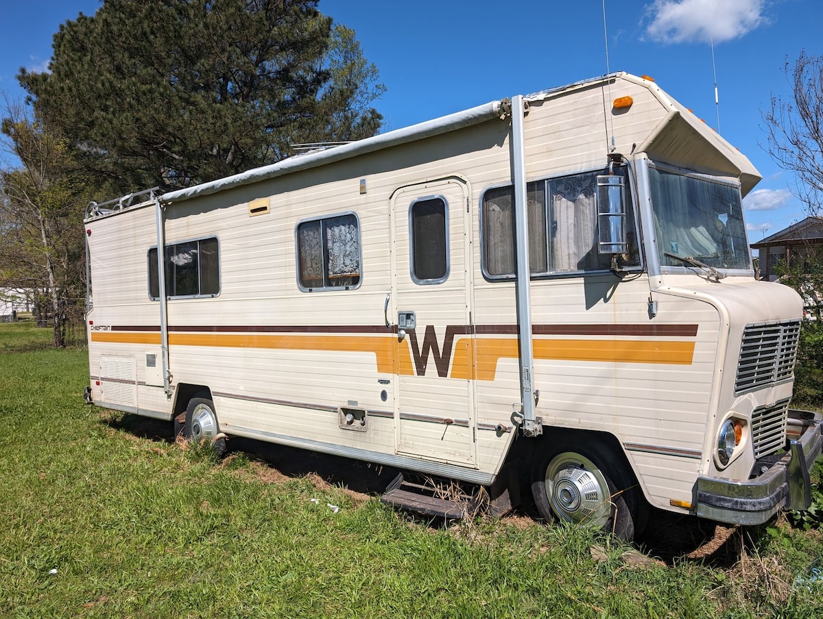 Viaja en el tiempo en nuestro Winnebago Chieftain de 1976 vintage. Completo con accesorios originales y alfombras pelusas. Es de acero macizo y un hermoso clásico. Mucho espacio para guardar, horno y estufa, y una bañera espaciosa. Hay una cama loft de tamaño completo y sofás que se convierten en camas individuales. Esto sería genial para una pareja o una pequeña familia. Somos amigables con los niños y los perros. Los ingresos de Airbnb se destinan al mantenimiento y la restauración del Winnebago.