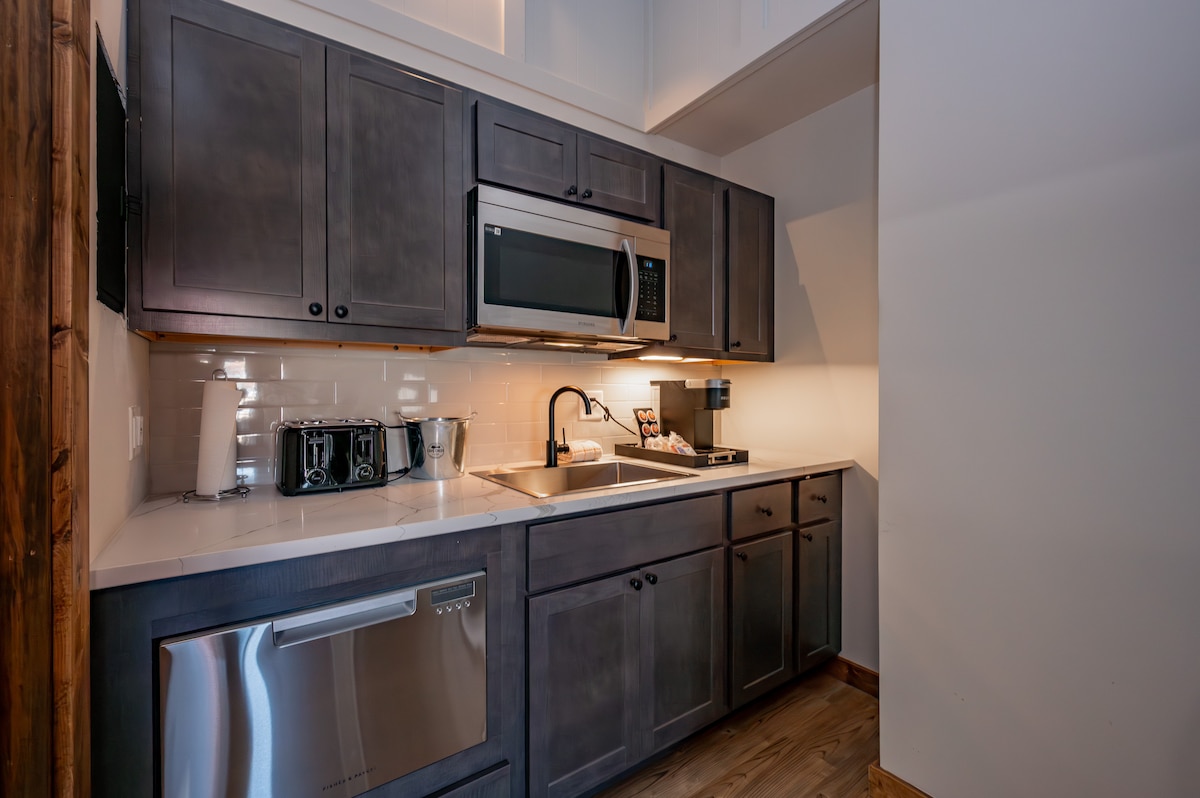 Comodidad y comodidad desde todos los ángulos, este refugio junto a la piscina te ofrece acceso a todo en solo unos pocos pasos. Relájate en la lujosa cama tamaño king y descansa para tu próxima aventura en el lago. Esta suite también tiene un sofá cama tamaño queen para espacio adicional para dormir. Equipado con una cocina completa para cocinar, TV inteligente y un lujoso baño con ducha a ras del suelo y productos de baño de calidad. Camina hasta tu patio privado para dos y disfruta del aire fresco de la montaña antes de dirigirte