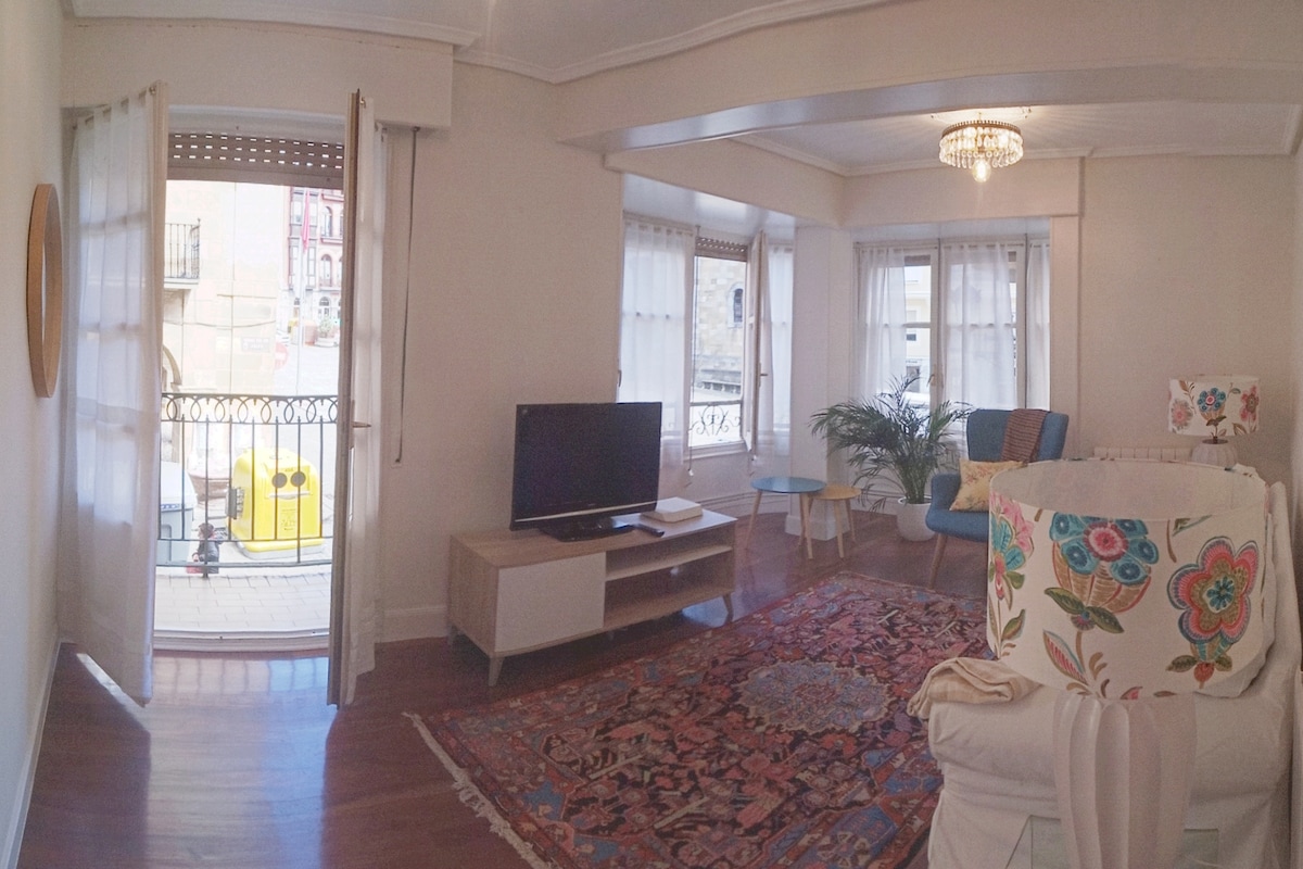 Precioso, luminoso y recién reformado apartamento en pleno casco antiguo de Bilbao, con unas vistas magnificas del teatro Arriaga y el paseo del Arenal.Tratamiento con OZONO para la desinfección del ambiente. El apartamento se encuentra situado en una casa palacio del año 1826. El alojamiento tiene una hab ppal. con cama de doble y salón-comedor con cómodo sofá-cama. Cocina totalmente equipada y menaje. El baño cuenta con ducha, toallas, secador y champú-gel ecológico🌸