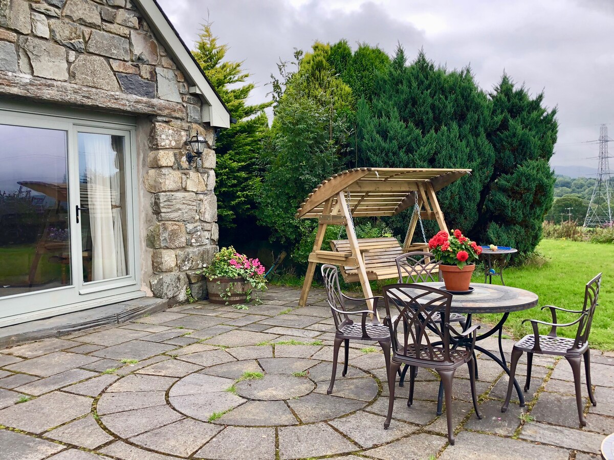 Luxurious Barn conversion - sleeps 2 which has breathtaking views of the Eryri (Snowdonia) Mountains Spacious open plan Living /Bedroom area with 1 king size bed. Fully equipped kitchen and dining table. Patio windows, outside area with swing seat and enclosed garden area. Bathroom with jacuzzi airbath, wetroom shower. The suite has full central heating and a log burner if you'd like the ambience of a log fire.. we leave you a starter pack of logs & kindling for your 1st evening fire :)