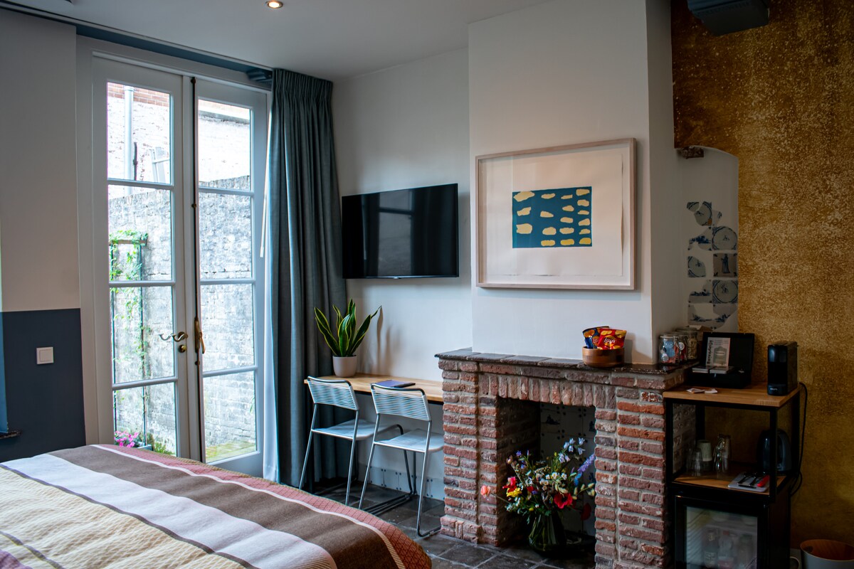 En el corazón de 's-Hertogenbosch («Den Bosch»), te ofrecemos una estancia de lujo en nuestra casa del siglo XV, bellamente renovada, llamada «Gulden Engel». Te alojarás en nuestra encantadora habitación de invitados en la planta baja, con una magnífica cama tamaño king. Bajo el edredón de plumón de ganso nunca pasarás demasiado calor o frío. Disfruta de una bebida (de cortesía) en tu pequeño jardín trasero. A menos de 300 pies puedes cenar en restaurantes con estrellas Michelin o disfrutar de la famosa kroket holandesa. ¡Todo es posible en Den Bosch!