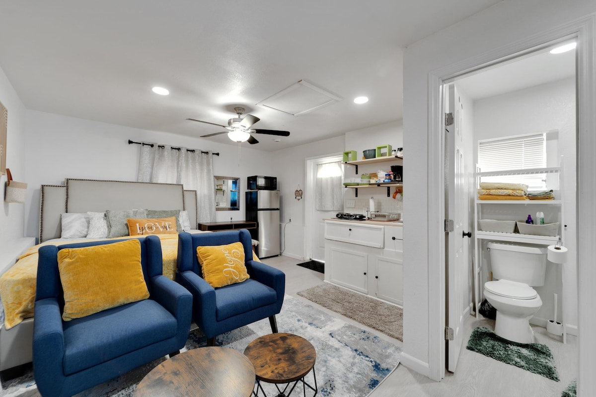 Espacio para 2. Estudio privado, entrada privada, estacionamiento enfrente. Prohibido fumar en el estudio. Gran ducha privada con suavizante, cabezal extraíble, cama tamaño king, televisión en color, cable, wifi. Mesa lo suficientemente grande como para ser utilizada para trabajar, microondas, cafetera, tostadora, nevera, cómoda, cajonera con almacenamiento colgante y ropa de cama incluida. Hay una sala de estar en la parte delantera para fumar y relajarse. Se ha añadido una unidad de aire acondicionado/calefacción instalada junto con nuestra unidad de sistema central estándar de la casa principal para mayor comodidad controlada por ti.