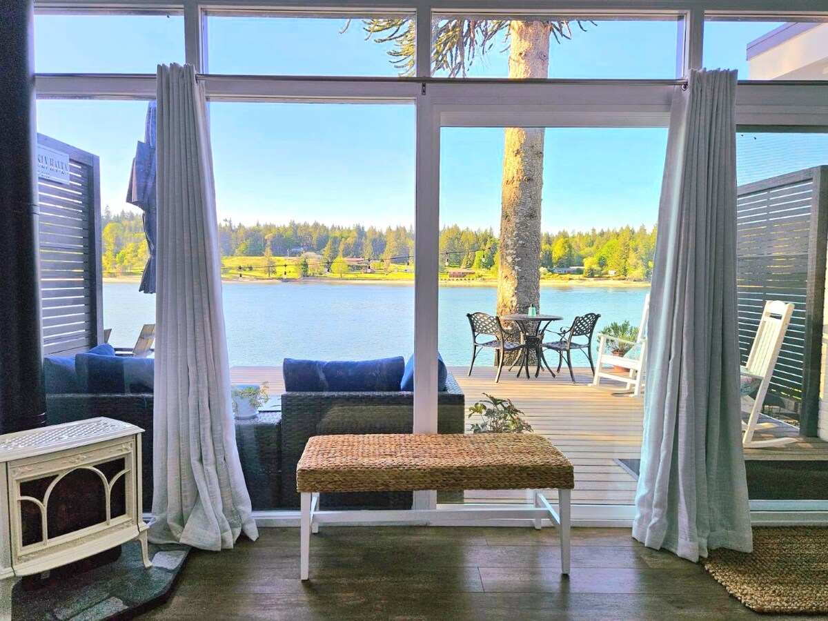 Spend lazy days on the deck as boats, seals, and herons pass by, or watch a film by the light of the wood-burning stove. Flowers, ferns, and a sparkling Tiffany lampshade add to the fresh vintage charm of this tranquil retreat with a pretty garden. The cottage features great western views of the mountains and water with spectacular sunsets, passing boats and wildlife watching. Large windows and high ceilings create a light filled space that is both cozy and inviting. P-000102