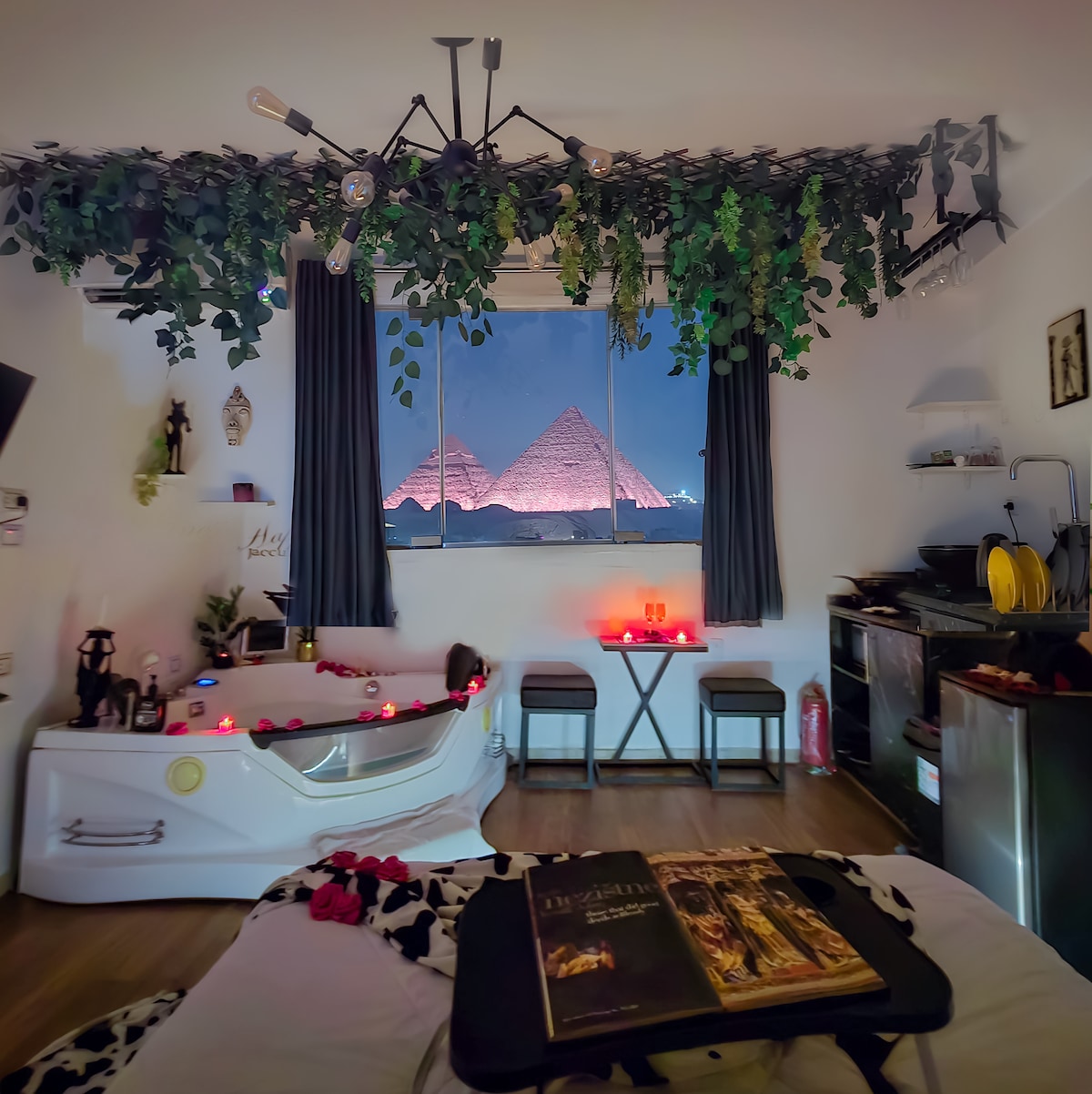 "Ready for a getaway that will mark a before and after in your travels? Do you want to start your day with a breathtaking view? This is the perfect place for you! We are the only ones in the market that offers you nature in this magnificent and radiant modern studio, with ambient lights, enjoy a romantic night and electric curtains to enjoy this amazing panoramic view of the legendary and powerful pyramids of Egypt.