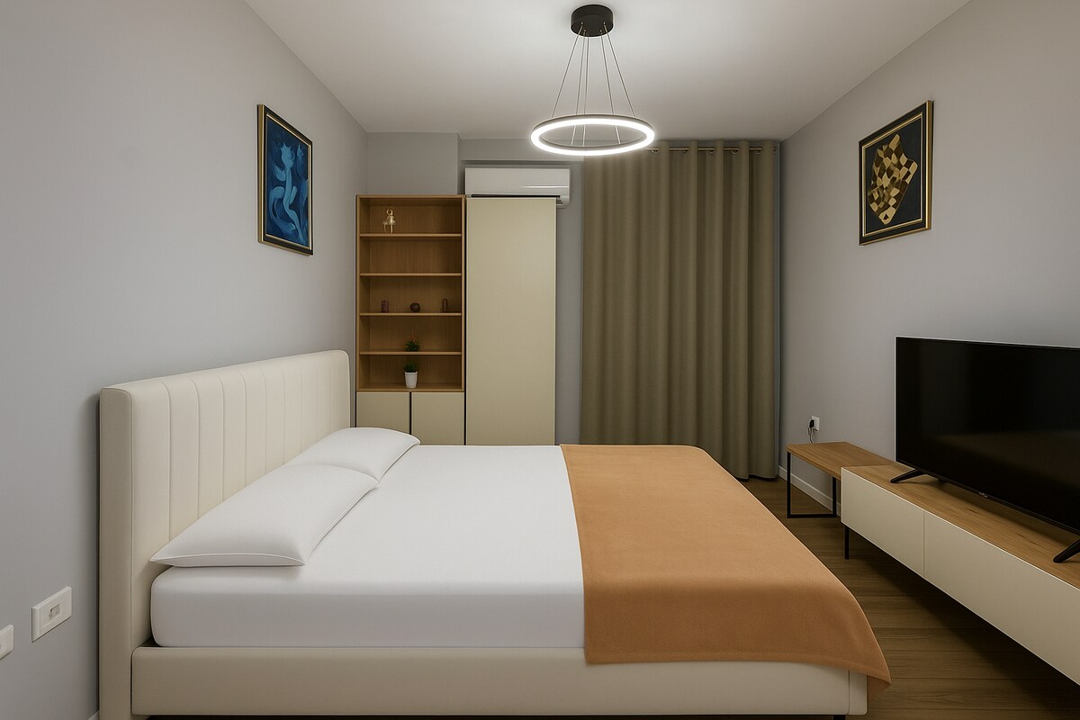 ¡Bienvenido a nuestro elegante y cómodo apartamento de un dormitorio, perfecto para parejas, viajeros solitarios o grupos pequeños! Situado en el centro de Kamëz, nuestro apartamento ofrece fácil acceso a todo lo que necesitas. A solo 10 minutos del Aeropuerto Internacional de Albania y a 15 minutos del centro de la ciudad de Tirana, es una base ideal tanto para viajeros de negocios como de placer. En el interior, encontrarás una cocina totalmente equipada, una acogedora sala de estar con un sofá cama y una decoración moderna y acogedora que te hace sentir como en casa .