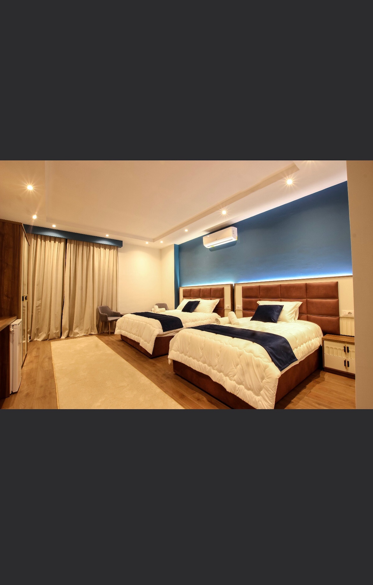 1 bedroom with 2 single beds can be attached to be a double bed and 1 bunk bed. wifi, free parking, air conditioning