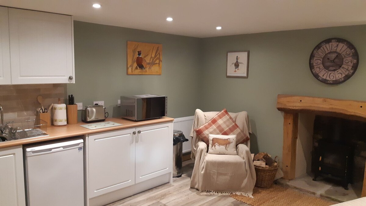 Una pequeña y encantadora Bothy reformada en nuestra granja en funcionamiento, situada en nuestro patio justo al lado/directamente enfrente de nuestra propia casa. Precioso interior con cocina bien equipada y comedor en la planta baja y estufa de leña. El baño también está abajo con cabina de ducha. En la planta superior hay un acogedor dormitorio estilo loft con techos bastante bajos, así que para los huéspedes más altos... ¡por favor, tened cuidado con la cabeza al meteros en la cama! Zona de jardín con muebles de jardín de bistró, bañera de hidromasaje y barbacoa (por favor, trae tu propio carbón).