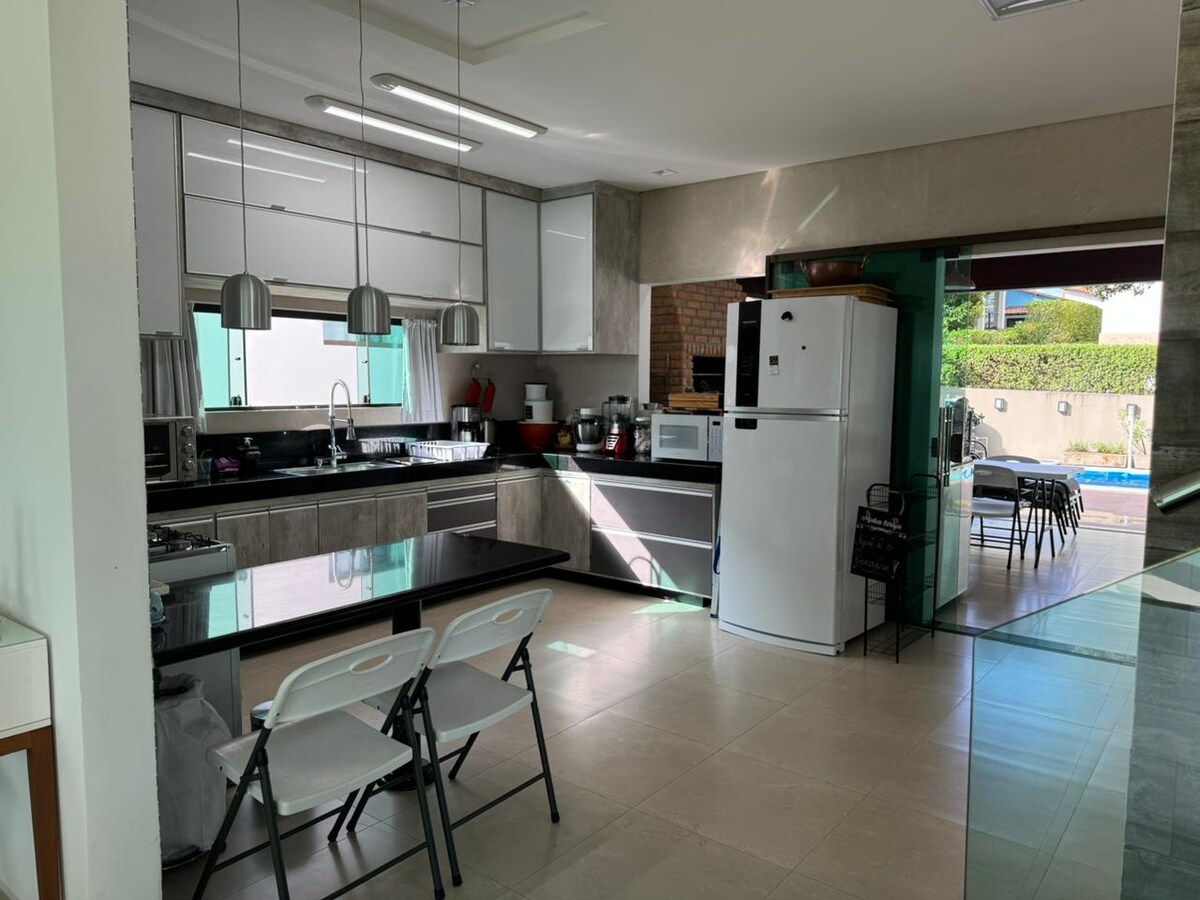 En una comunidad cerrada con conserje las 24 horas. Más de 600 m² de superficie construida (plana), dos estructuras de casa integradas e independientes. Tenemos una terraza con piscina privada, dos áreas de ocio completas con mesa, 5 televisores inteligentes de pantalla grande, Internet rápido, 2 barbacoas, nevera, congelador, máquina de hielo, máquina de cerveza, máquina de champán y suite principal con jacuzzi. Cerca del centro de Gravatá, pero al mismo tiempo parece que estamos lejos. Clima de montaña en invierno y clima de playa en verano. Se admiten mascotas