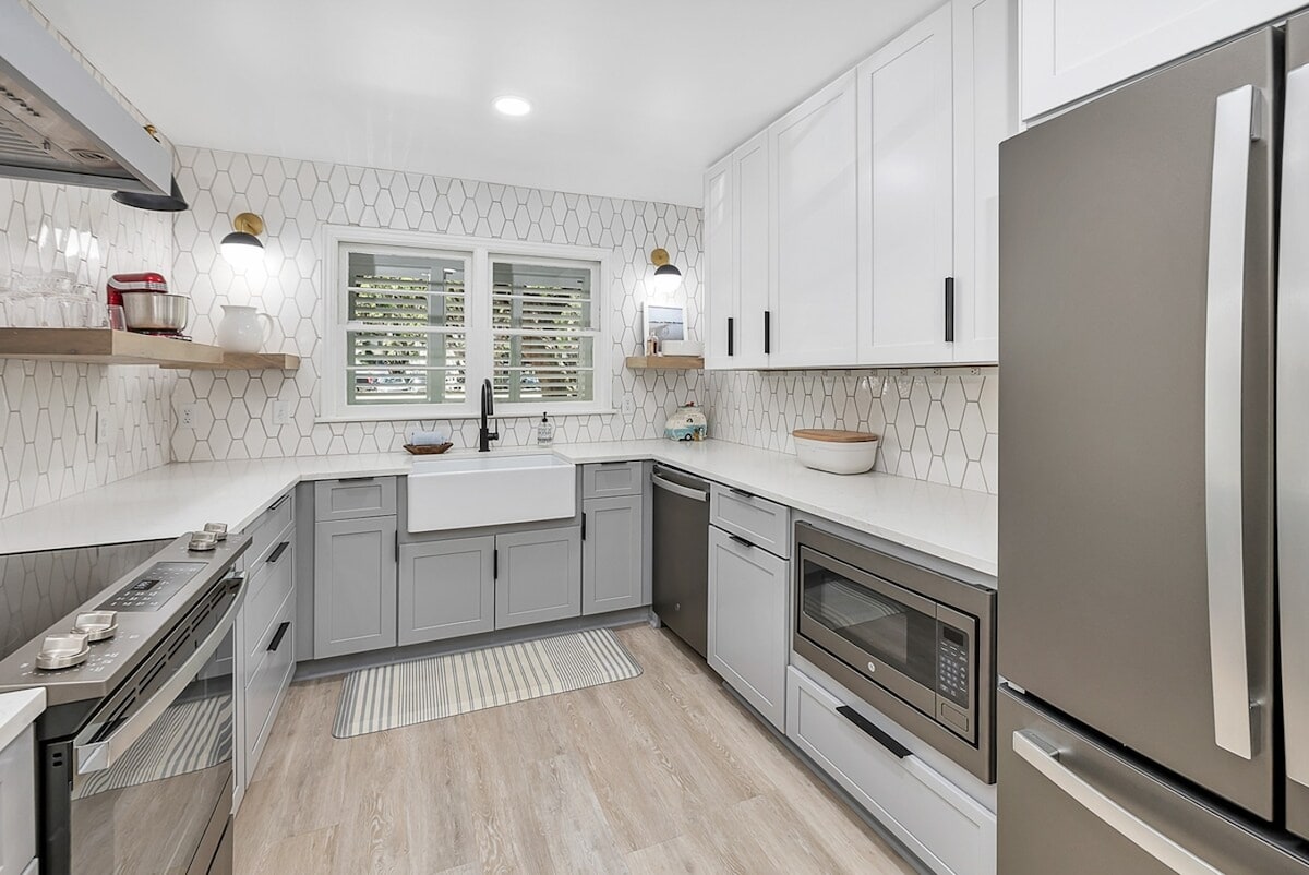 The Freddie is a newly updated 3-bedroom, 3.5-bathroom coastal cottage in the heart of St. Simons Island. It features an open floor plan with a fully equipped kitchen, dining area for six, living room with a fireplace, and a screened porch for relaxing. The master bedroom with a king bed is on the first floor, and upstairs offers a bunk room that sleeps five, a king guest bedroom, and a sitting area with a coffee station. All bedrooms have ensuite bathrooms. The home comfortably sleeps nine gues