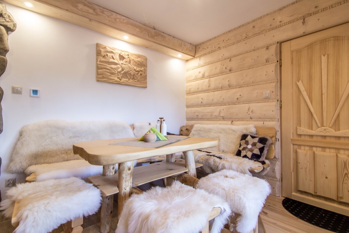 Apartamento cerca del valle Deluxe es un cómodo apartamento, cuyo interior combina modernidad con toques regionales. Con detalles sutiles como luces, madera y decoración forjada, muebles cómodos y motivos de montaña, los huéspedes recordarán los momentos que pasarán aquí durante mucho tiempo. Hay una chimenea de piedra en la sala de estar y una SAUNA en el pasillo.