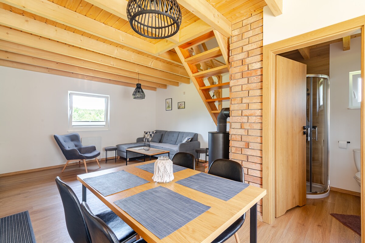 El precio de la estancia incluye acceso ilimitado al jacuzzi y a la sauna. Casa de campo Wabi Sabi para un máximo de 4 personas en el bosque junto a un lago en Casubia. Ofrecemos una casa de dos plantas de unos 45 m2 con dos dormitorios separados, una sala de estar común con zona de cocina, comedor, baño y una gran terraza rodeada de bosque. La parcela en la que se encuentra la casa tiene unos 500 m2 y está vallada. Además, en la gran terraza de madera tenemos un jacuzzi y una sauna solo para los huéspedes de la casa. Nuestra casa es para todo el año, tiene calefacción y una estufa. El lago Sudomie está a 150 m.