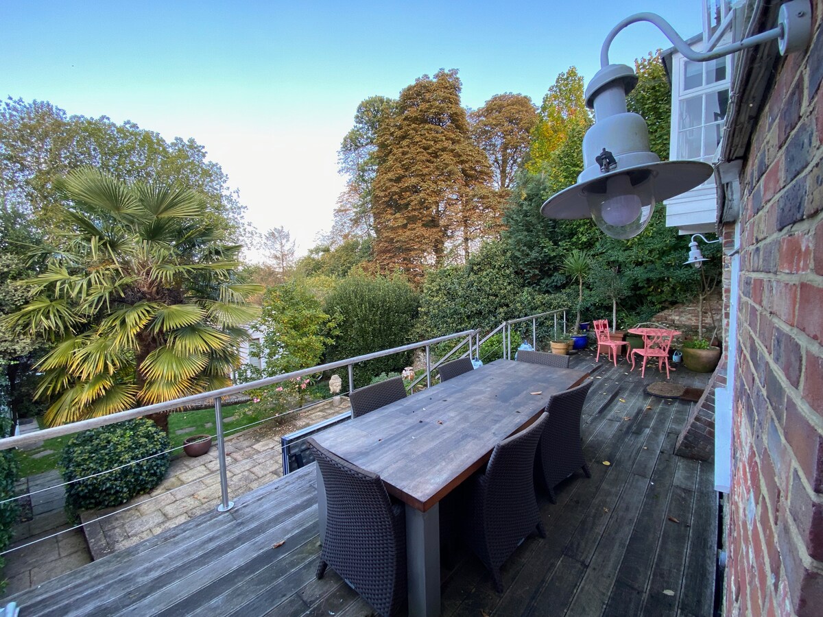 Una casa de campo independiente situada en una posición tranquila rodeada de bosques a 4 millas del centro de la ciudad de Guildford y reformada con un alto nivel con cocina totalmente equipada y un lavadero con lavadora, secadora y aseo en la planta baja. Hay cuatro dormitorios, uno con baño privado y un baño familiar. Estacionamiento para 3 coches. Amplio jardín con patio y asientos y una gran cama elástica con red para su uso bajo su propia responsabilidad. En nuestro hogar todas las personas son bienvenidas, vengan de donde vengan.