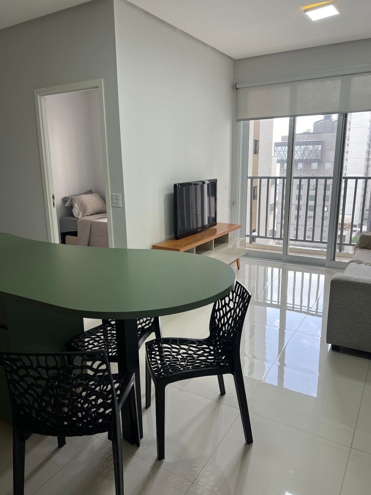 Apartamento moderno para 4 pessoas no sofa cama. Com TV, ar condicionado, WiFi , no 11 andar . Possui 1 quarto com cama queen com ar-condicionado + 1 sofa cama. Atende 4 pessoas. Sala c/ ar-condicionado e Smart TV, Cozinha completa, equipada com fogão, micro-ondas, cafeteira, Airfrer, sanduicheira liquidificador, cozinha completa. Terá o cantinho do café + máquina d lavar. Fechadura electronica,Portaria e Segurança 24 horas, 3 piscina e Academia. E Hot tub . Apartamento novo .