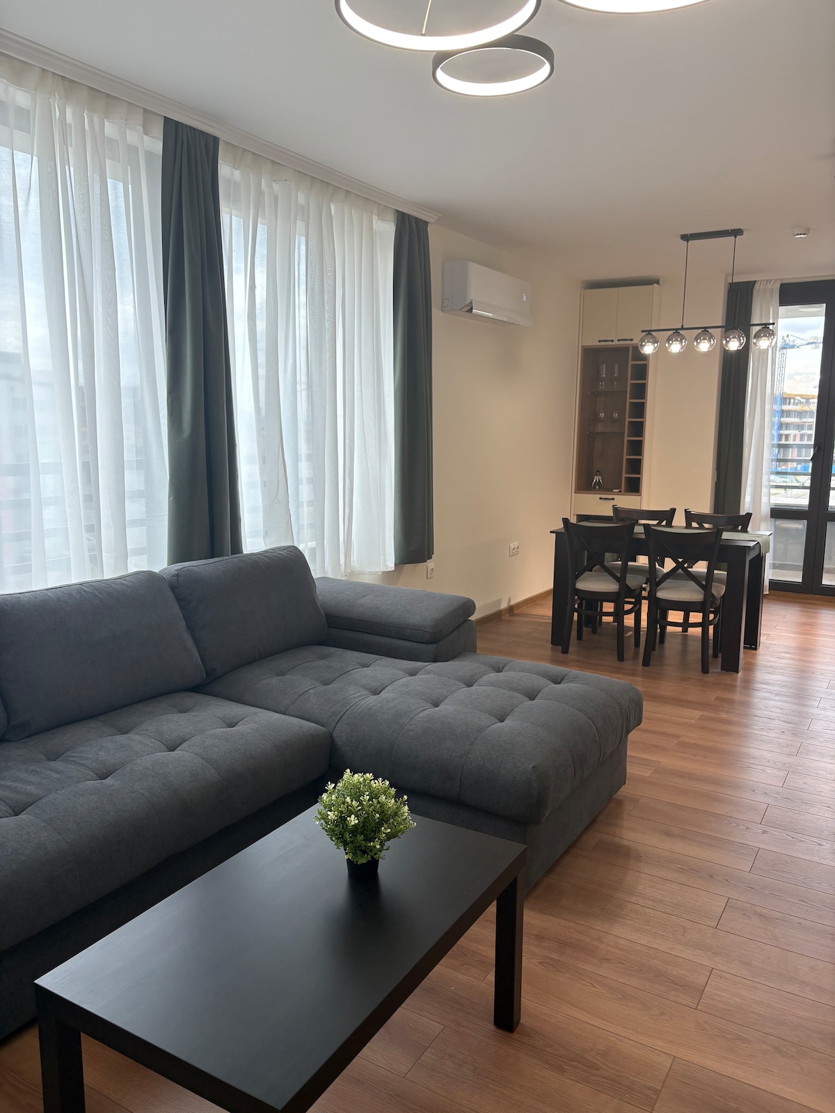 Un nuevo apartamento acogedor con una gran vista de la montaña Vitosha. Amueblado en un estilo interior contemporáneo, lo que hace que se sienta espacioso y amplio. El apartamento se encuentra en un complejo privado, en el noveno piso. ¡Un lugar acogedor y cómodo! A solo 8 minutos a pie de la estación de metro Inter Expo y a 10 minutos en coche del centro de la ciudad. También es muy cómodo llegar al aeropuerto, tanto en metro como en taxi.
