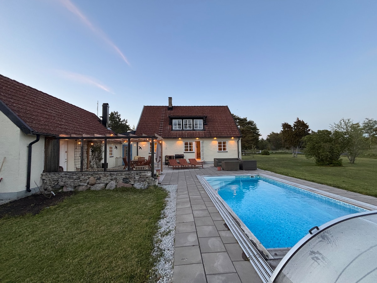 Modern villa med pool och stora sällskapsytor inne och ute. För familjer som vill upptäcka Gotland men samtidigt ha det bekvämt Hyrs ut veckovis: V27 måndag- måndag V28 måndag- måndag V29 tisdag-tisdag 10 min till Visby med bil. Flera sovrum, 3 toaletter, 2 duschar (1 utedusch) bastu. Tempererad pool och solstolar och weber gasolgrill. I anslutning till huset finns ett 14 km löpspår längs vattnet och har litet eget gym i garaget. Promenadavstånd till havet och solnedgångar som är magiska