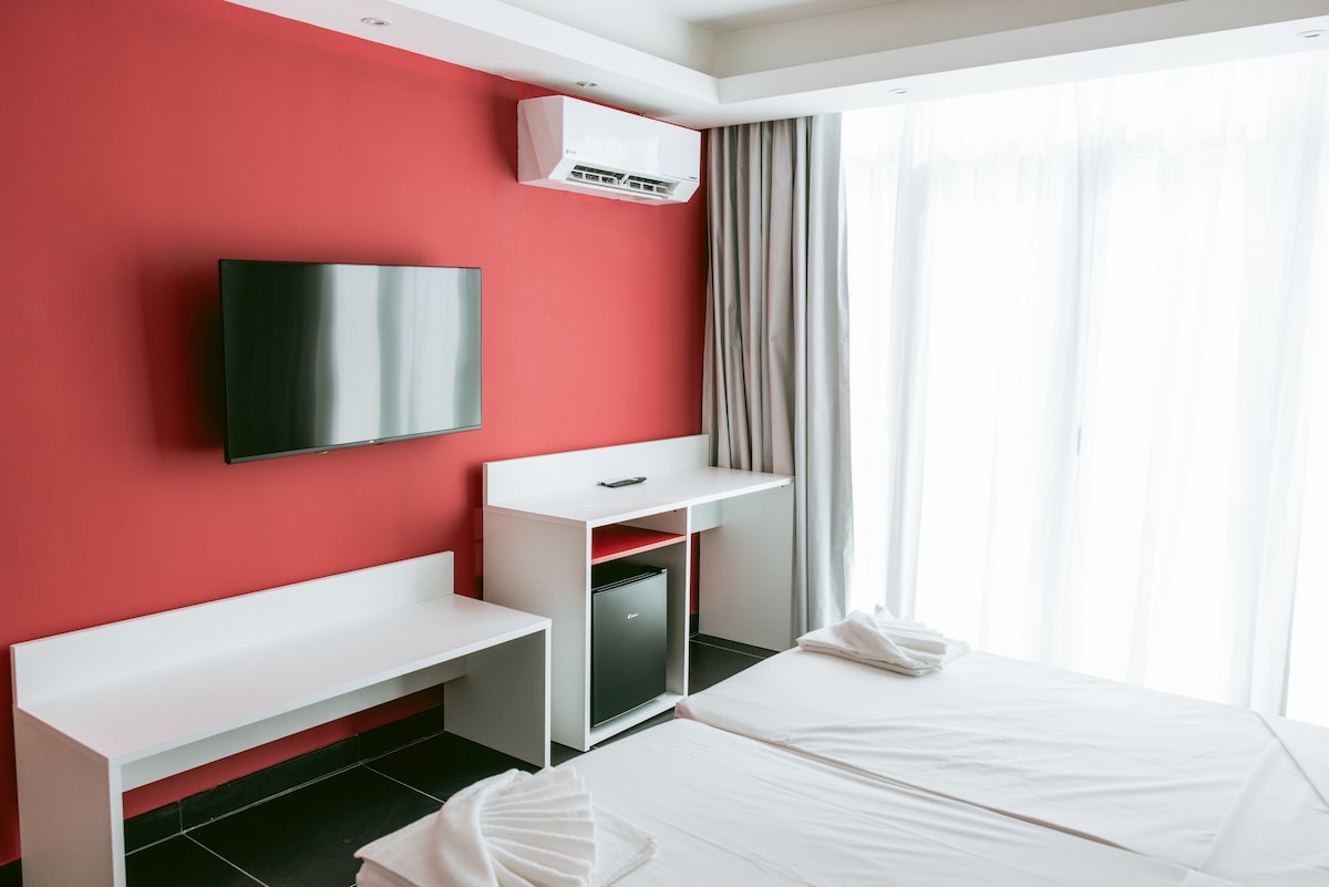 Bienvenido a nuestra indulgente habitación de hotel, donde te espera la relajación. Sumérgete en la felicidad pura con un refrescante jacuzzi. Esta habitación doble con aire acondicionado incluye un televisor de pantalla plana con servicios de streaming, una caja fuerte segura , mininevera , baño privado con ducha y una terraza, todo mejorado por cortinas opacas que garantizan una experiencia tranquila y relajante como ninguna otra.
