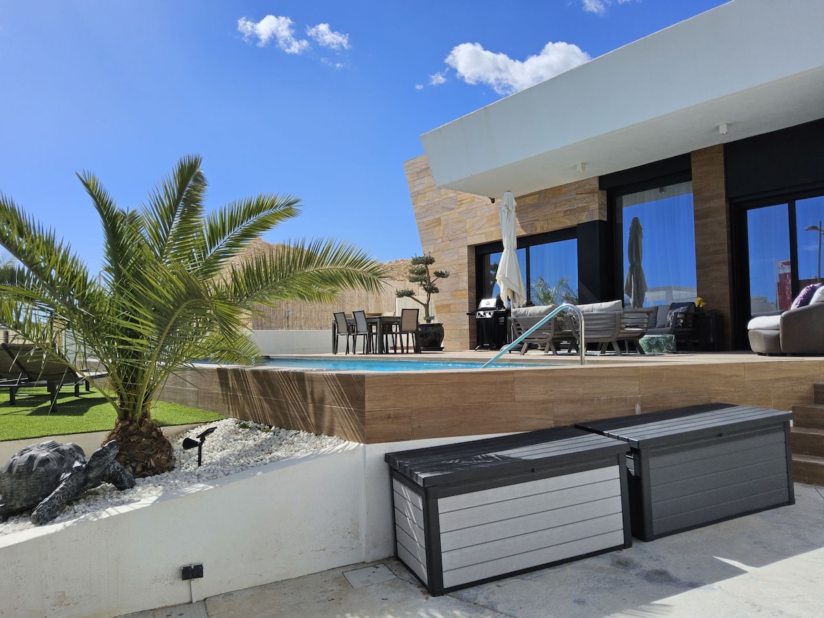 Soleado chalet con piscina privada de agua salada y gran jardín (200m2), "eco-friendly" con paneles solares, vistas al mar, a sólo 5 minutos de la playa. Cuenta con una terraza de 100m2 con pérgola para pasar el tiempo en el exterior y disfrutar del excelente clima. La casa tiene 130m2 con 2 plantas. Recientemente reformado. Con espacio para tomar el sol y juegos, gracias a su orientación al sur y relajarse en un ambiente mediterráneo. Muy cerca del centro de Santa Pola caminando.