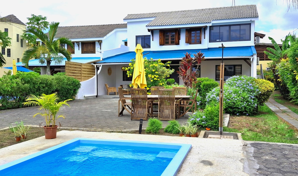 Beautiful duplex apartment overlooking a stunning beach and the turquoise lagoon of Pointe d’Esny. Upstairs: three bedrooms and three en-suite bathrooms. The master bedroom has a sea view and a 1.80-meter wide bed; the second bedroom has two 90 cm wide beds; and the third bedroom has a 1.60-meter wide bed. On the ground floor: living room, terrace, toilet, fully equipped kitchen. Free Wi-Fi.