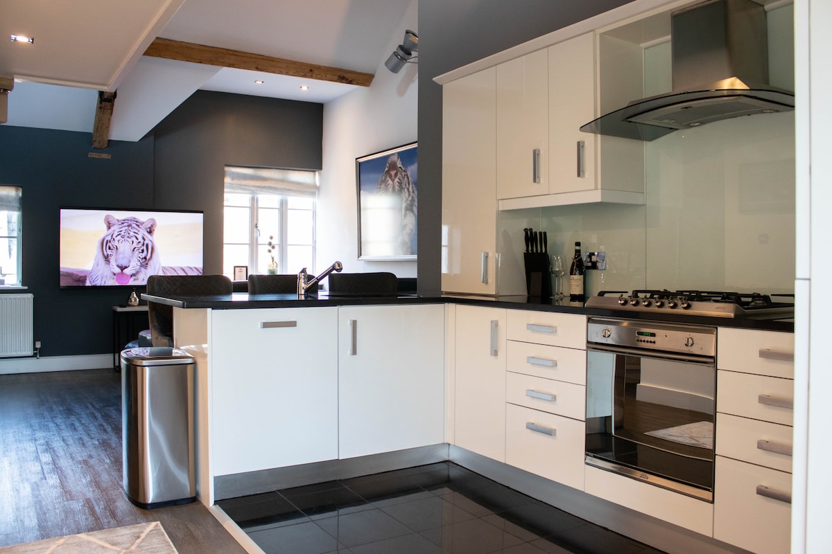Conversión de granero única con aparcamiento privado fuera de la carretera en Sale, Gran Manchester. De planta abierta con un dormitorio en el entresuelo al que se accede por una escalera de caracol, la propiedad está separada y situada en un jardín privado maduro. Cerca de todos los servicios del centro de la ciudad de Sale y excelentes conexiones con Manchester, Altrincham y a poca distancia en taxi del aeropuerto de Manchester; nuestro alojamiento es ideal para estancias cortas, ya sea por placer o por negocios. Ten en cuenta que el dormitorio tiene restricción de altura.