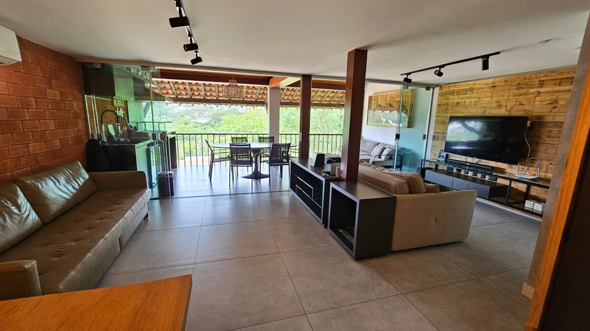 En una comunidad cerrada con conserje las 24 horas. Más de 600 m² de superficie construida (plana), dos estructuras de casa integradas e independientes. Tenemos una terraza con piscina privada, dos áreas de ocio completas con mesa, 5 televisores inteligentes de pantalla grande, Internet rápido, 2 barbacoas, nevera, congelador, máquina de hielo, máquina de cerveza, máquina de champán y suite principal con jacuzzi. Cerca del centro de Gravatá, pero al mismo tiempo parece que estamos lejos. Clima de montaña en invierno y clima de playa en verano. Se admiten mascotas