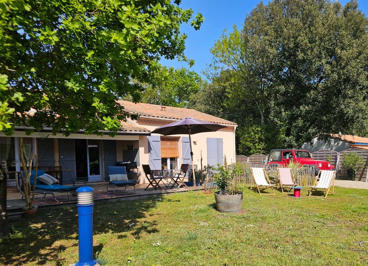Relájese en esta villa de 100 m2 cómoda y elegante - Clasificada 4 estrellas "Étoiles de France". En el centro de viñedos y los vinos más grandes del mundo. El océano a 15 minutos en más de 30 km de playa. Totalmente renovada, cálida, luminosa; esta encantadora villa le ofrece una hermosa sala de estar de 45 m2, chimenea con inserción, cocina, 2 hermosas habitaciones con camas queen size, 1 dormitorio con literas, 1 baño, ducha a ras de suelo, 1 terraza, 1 barbacoa, 1 gran jardín .