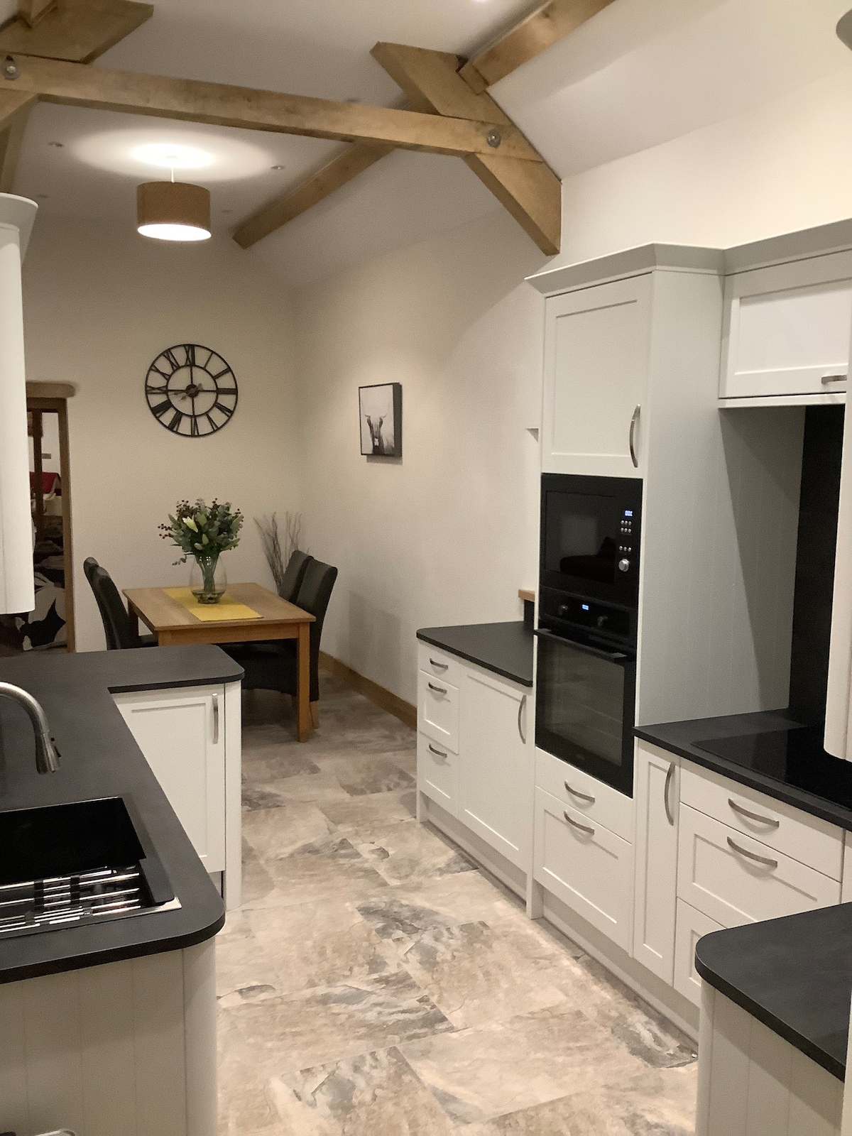 Esta casa de invitados del siglo XIX, reformada por expertos, está llena de carácter y lista para tu lujoso y relajante descanso. La sala de estar de planta abierta tiene una vista excepcional y, cuando quieras un cambio, hay una gran televisión inteligente y banda ancha de buena calidad para el entretenimiento. La cocina cuenta con placa de inducción y horno, lavavajillas y lavadora, así como todas las ollas, sartenes y utensilios que necesitas para cocinar deliciosas comidas. El baño con ducha/inodoro está convenientemente escondido en una esquina. Sube por la distintiva escalera de roble para encontrar el dormitorio de arriba, con su impresionante ventana redonda. Tiene capacidad para tres personas en una cama doble tamaño king y una individual separada, y también hay espacio para una cuna de viaje para un bebé. La casa es ideal para una pareja en una escapada romántica o para una familia con niños pequeños que buscan un espacio seguro para relajarse y jugar. CARACTERÍSTICAS PRINCIPALES - Un dormitorio arriba, con cama tamaño king doble y cama individual, espacio para cuna de viaje. - Un baño con ducha/WC: abajo. - Capacidad para tres personas y un bebé. - Zona de terraza exterior privada con vistas, uso compartido de 1,5 acres de prado y jardines seguros. - Se admiten perros, dos como máximo, pequeño cargo adicional. - Se admiten niños pequeños (pero es posible que tengas que traer una puerta de seguridad para las escaleras). - Smart TV (Netflix, iPlayer, Freesat, etc.). - Banda ancha de buena calidad/wifi (gratis). - Placa de inducción, horno, microondas, nevera (congelador disponible si es necesario), lavavajillas. - Mesa de comedor para cuatro, dos sofás de cuero. - Lavadora (y uso de secadora si es necesario). - Calefacción por suelo radiante (alimentada por bombas de calor de fuente de aire ecológicas). - Estufa de leña, primera cesta de leña gratis. La casa de invitados se puede reservar por semana (día de inicio el viernes) y para escapadas cortas de fin de semana y a mitad de semana.