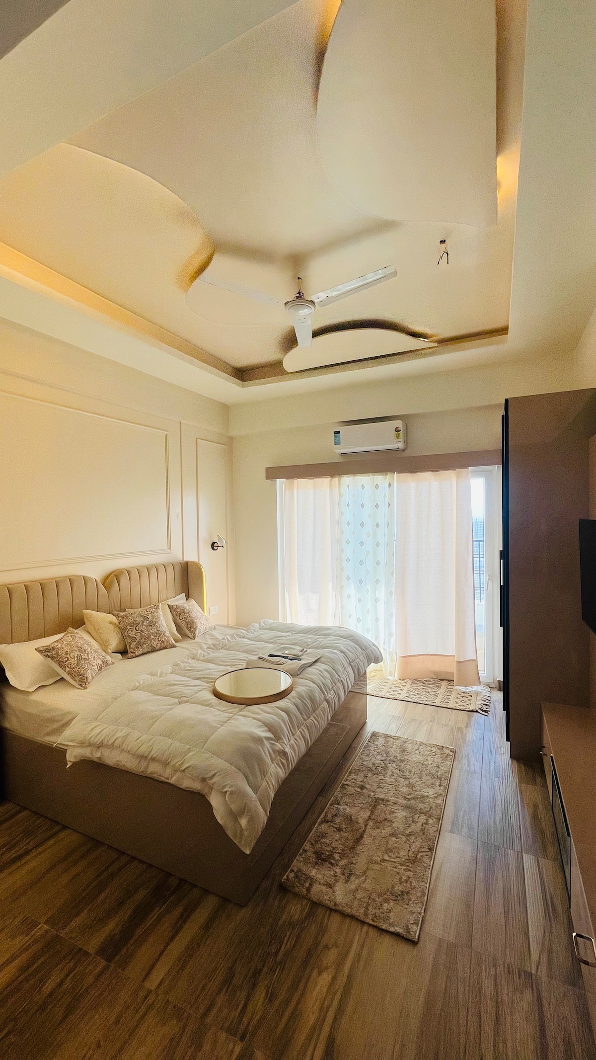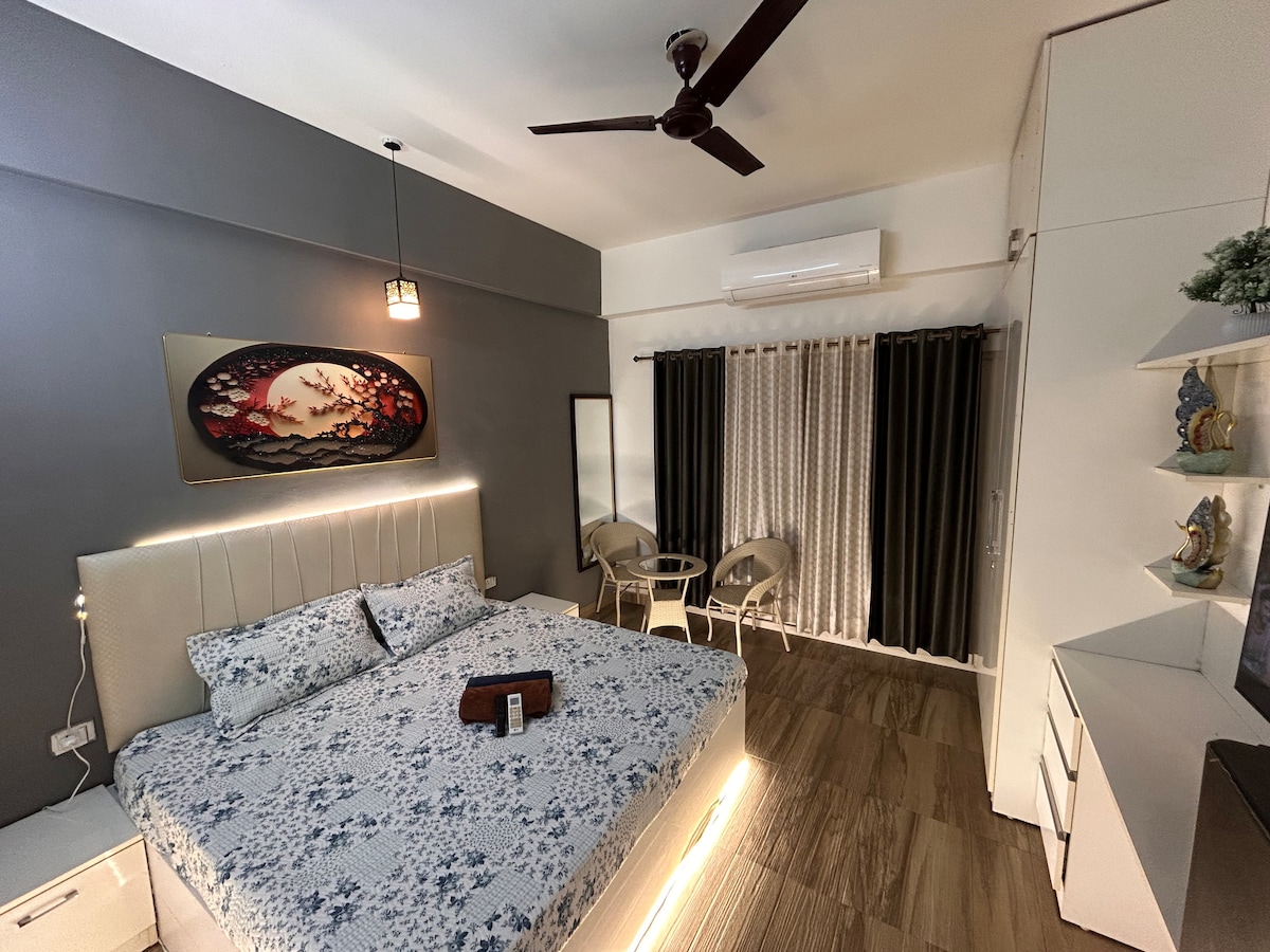 Winter-ready luxury studio near Expo Mart & Metro. Cozy, festive, couple-friendly stay with balcony, Wi-Fi & free parking at Wegmans Tower. Designed with warm tones, elegant décor, and modern comfort, it’s the perfect retreat for business travelers, couples, or families. Enjoy cozy interiors, high-speed WiFi, and easy access to the India Expo Center and Delhi NCR. Whether for work or leisure, your stay here promises style, comfort, and memorable moments.