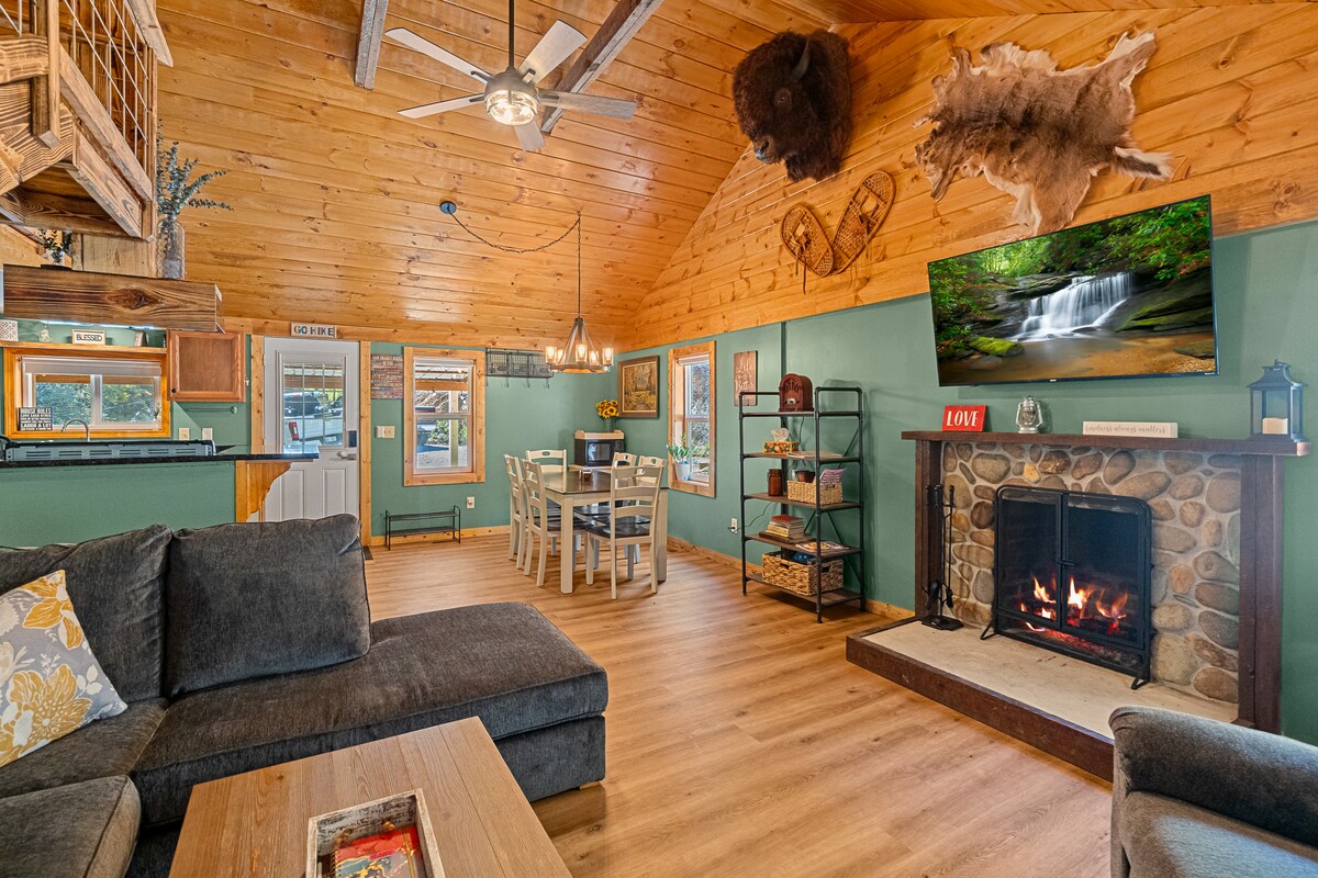 ¿Buscas una escapada tranquila, acogedora y privada enclavada en las montañas Smoky con impresionantes vistas y sin vecinos? ¡La has encontrado! Casa de campo rústica en 40 acres con terraza privada cubierta. El apartamento tiene entrada exterior privada con llave, TV de 55 pulgadas con varios servicios de streaming, sillón reclinable doble, baño, jacuzzi/ducha, chimenea de leña, lavadora/secadora, mesa de comedor con sillas y cocina americana (nevera, microondas, placa eléctrica, cafetera). El enorme patio vallado ofrece mucho espacio para que tu mascota corra.