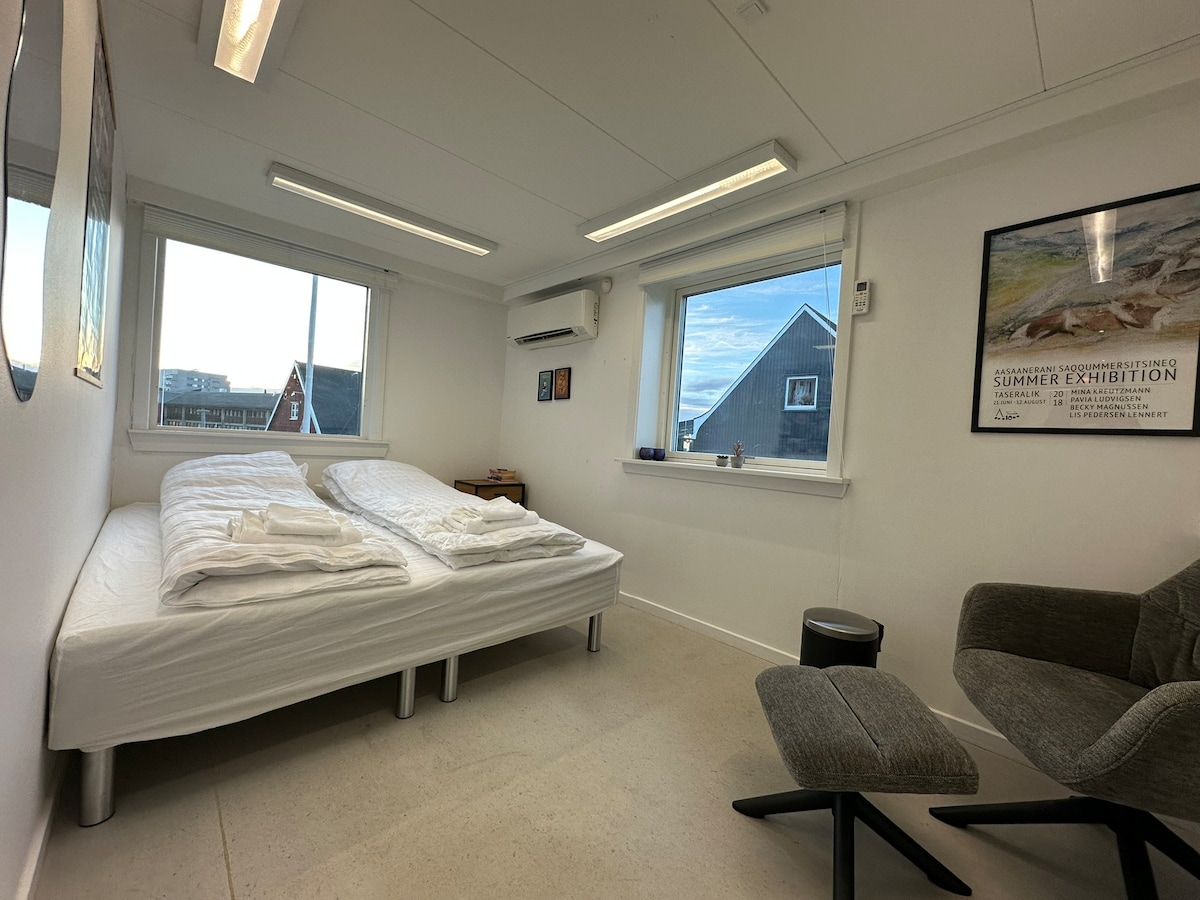 Habitación C Acogedora casa de huéspedes en el centro de la ciudad de Nuuk, a poca distancia a pie de cafeterías, restaurantes, tiendas y el antiguo puerto de la colonia. Las habitaciones son cómodas y están decoradas con colores alegres, y tienes acceso a una sala de estar/cocina y baño compartidos. Base perfecta para viajeros solitarios, parejas, gente de negocios y grupos que quieran experimentar la capital de Groenlandia desde un entorno céntrico y hogareño. Durante el período del 9 al 16 de octubre de 2025, la cocina se trasladará a la sala común, y la habitación estará equipada con una cama doble.