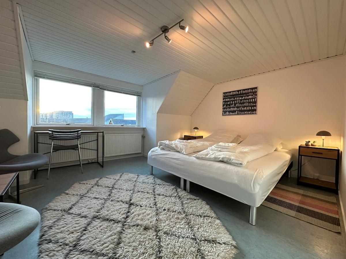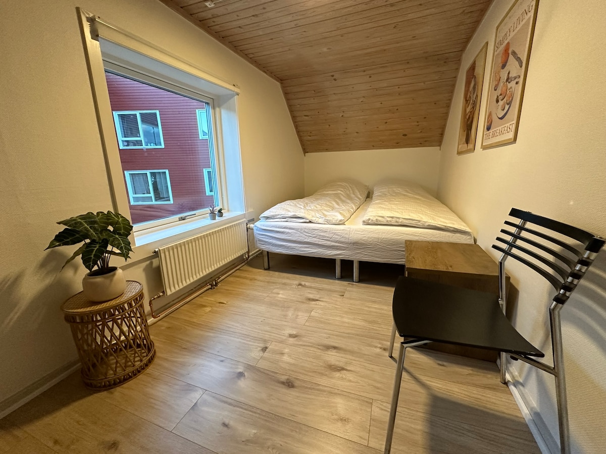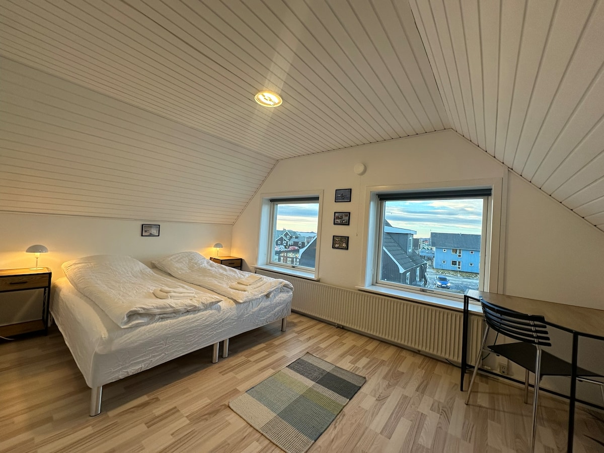 Habitación A Acogedora casa de huéspedes en el centro de la ciudad de Nuuk, a poca distancia a pie de cafeterías, restaurantes, tiendas y el antiguo puerto de la colonia. Las habitaciones son cómodas y están decoradas con colores alegres, y tienes acceso a una sala de estar/cocina y baño compartidos. Base perfecta para viajeros solitarios, parejas, gente de negocios y grupos que quieran experimentar la capital de Groenlandia desde un entorno céntrico y hogareño. NOTA: Del 9 al 16 de octubre de 2025, la cocina de la 1.ª planta se trasladará a la sala común. Habrá artesanos en la casa durante el período.