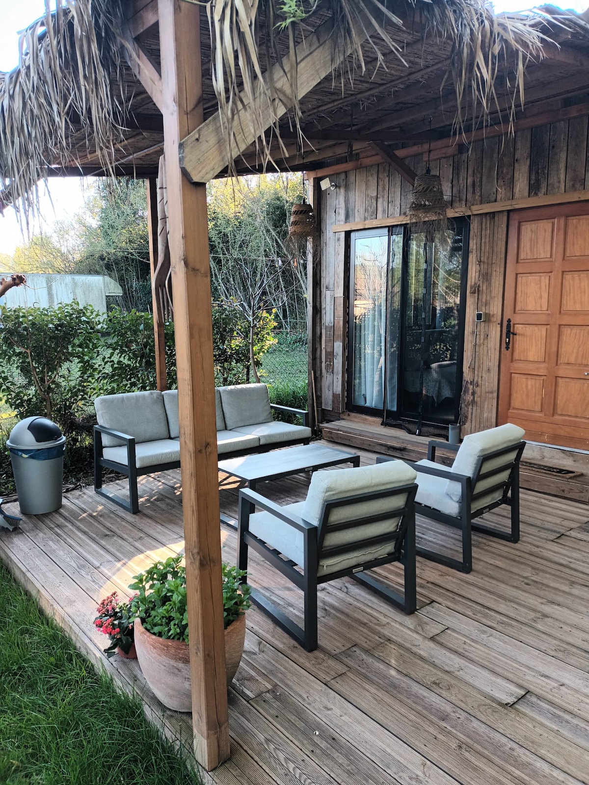 Agradable chalet de 50 m2 muy bien equipado para 6 personas . 2 dormitorios con vestidor, uno de ellos con tv, un convertible en el salón con tv. En el exterior, una zona de comedor con barbacoa y una zona de salón + tumbonas en una parcela de 270 m2 con capacidad para un vehículo. Muy bien situado en una zona tranquila, pero cerca de las actividades del camping, se le pedirá un cheque de 80 euros por la limpieza que se le devolverá al final de la estadía si todo está limpio