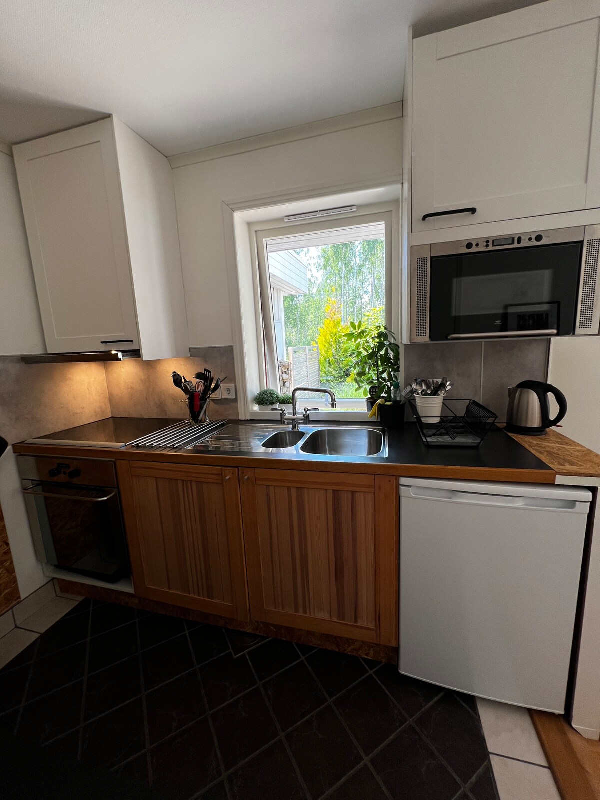 Alojamiento pequeño pero espacioso (25 m2 + altillo) luminoso y acogedor, cómodo y confortable. Cerca (150 m) del lago, baño y relajación. Relájate en este alojamiento único y tranquilo. Moderno, construido en 2018, con calefacción durante todo el año y con todas las comodidades. En verano, acceso a un cenador en la parcela si se quiere un poco más de espacio para socializar. Pasea por los hermosos alrededores, corre por la bonita pista de ejercicio de Kilenegården, monta en bicicleta o alquila una tabla de paddle surf.
