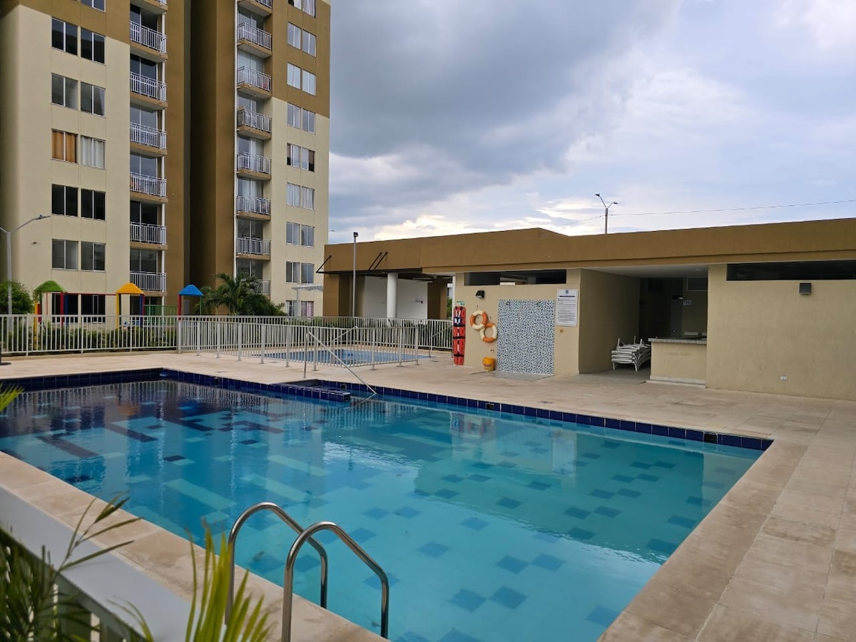 APARTAMENTO EXCLUSIVO, con aire acondicionados en todas las habitaciones, disponible parqueadero, excelente ubicación con acceso a las piscinas, a 5 mn del PARQUE DE LA LEYENDA VALLENATA, del RIO GUATAPURI y del Comercial Guatupurí. Todas las habitaciones cuentan con aire acondicionado. Todo lo que necesitas para disfrutar del Festival Vallenato o descansar y conocer la tierra de Francisco el Hombre. Lunes la piscina estará cerrada por mantenimiento.
