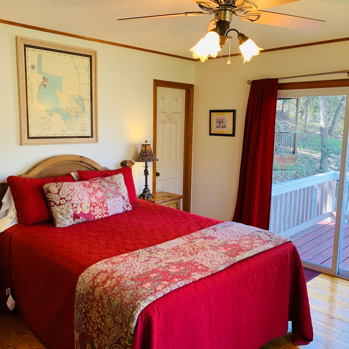 Primitive Cabin at Fernweh Riverfront on the Guadalupe River, Topaz is one of three cabins located on the property with private river access. Appointed with 2 queen size beds, your sleep should be comfortable in the fresh new linens and soft pillows. A communal restroom and showers are a short walk away and shared by the three primitive cabins. Parking Available = 2 Spots