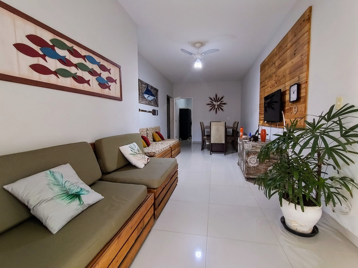 Amplio departamento frente a la moderna playa de Peracanga, con una decoración única y elegante. Edificio nuevo, seguro y bien ubicado en la calle principal de Enseada Azul, cerca de todo lo que necesitas. Tres playas paradisíacas (Guaibura, Peracanga y Bacutia) están tan cerca que ni siquiera tendrás que sacar tu auto del garaje: ¡ubicación privilegiada! Las habitaciones están totalmente equipadas para tu comodidad, con wifi en todas las habitaciones.