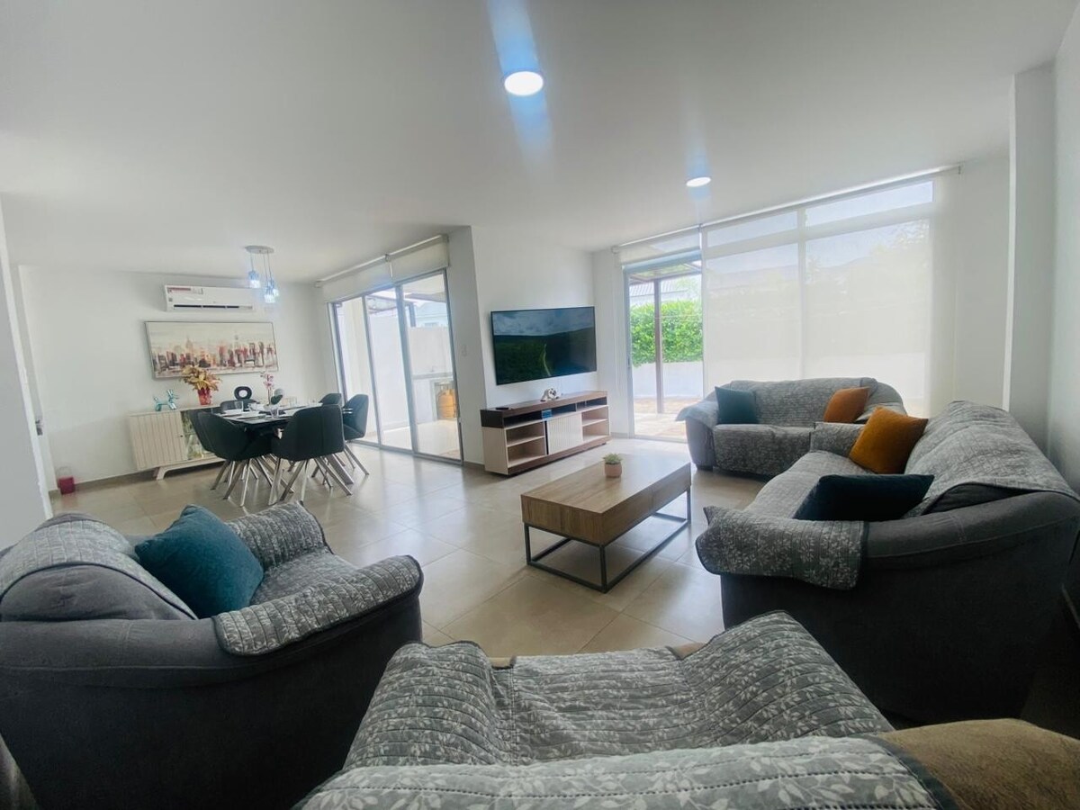 Alojamiento diseñado para el disfrute de familias y parejas que buscan descanso, tranquilidad . Un lugar con seguridad privada 24 h ,donde puedes disfrutae de un paseo junto al rio , parque y juegos infantiles ✔️Sala ✔️Comedor ✔️Cocina ✔️Patio ✔️Baño de visitas ✔️Cuarto Master con baño privado ✔️Cuarto con una cama y baño privado. ✔️Lavandería ✔️PetFriendly ✔️Parqueo ✔️Sector de parque con bbq y vista al río Tus vacaciones serán inolvidables ¡Te encantará el diseño moderno de este Airnb!