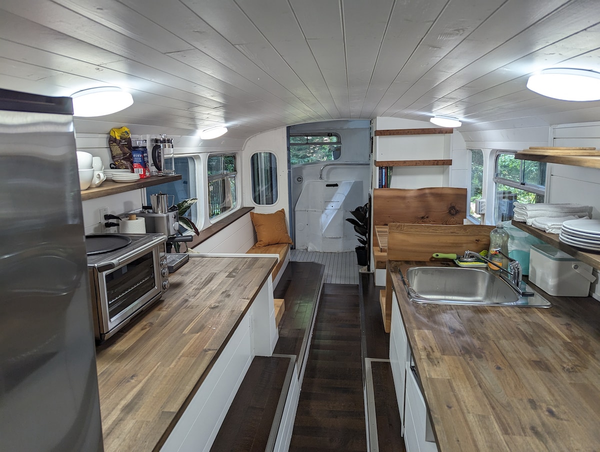 Canaliza la búsqueda de la tranquilidad en esta casa de tierra única. El acogedor refugio fue esculpido a mano con materiales naturales locales y sostenibles, y cuenta con un espacio vital central con escaleras de losa en voladizo que conducen al dormitorio loft. Los huéspedes tienen acceso a toda la casa y al alojamiento circundante. Vivimos en la casa vecina y nos complace darte consejos o responder a tus preguntas para que disfrutes al máximo de tu estancia. El barrio es bastante rural y en su mayoría agrícola con varias fincas y un pequeño viñedo privado. La casa está a 10 minutos a pie de la playa y a 20 minutos a pie de una tienda de comestibles y delicatessen familiares especializados en productos orgánicos locales. Mayne Island tiene un pequeño autobús comunitario. Los horarios y las rutas son limitados, especialmente en invierno. Se detendrá en la entrada. También contamos con un sistema oficial de autoestop con paradas señalizadas donde puedes esperar a que te recojan. Por lo general, no tienes que esperar mucho. Estamos encantados de recoger y conducir a los viajeros sin automóviles al muelle del ferry, como cortesía para alentarlos a venir, en los días en que el autobús comunitario no está funcionando. Por favor, haznos saber con antelación si vas a venir sin tu propio transporte y nos aseguraremos de que nosotros o el autobús comunitario (que te dejará en nuestra entrada) estará allí para recogerte cuando llegue tu ferry. Las terminales de BC Ferries cerca de Victoria y Vancouver son fácilmente accesibles en transporte público desde sus respectivos aeropuertos y centros de la ciudad.