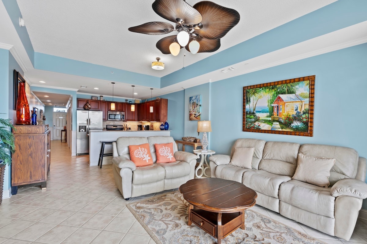 ¡Esquina de lujo actualizada con 1 cama/1 baño frente al mar! Suelos de baldosas por todas partes, dormitorio privado con cama tamaño king, literas (individuales pequeñas) en el pasillo, sofá cama tamaño queen. Cocina totalmente equipada con electrodomésticos nuevos. ¡Balcón de esquina cubierto frente al mar con parrilla! ¡A 3,50 millas de la playa! Restaurantes, vida nocturna, cine, puerto deportivo con barcos/cruceros de alquiler, sala de juegos, noria, tiendas, el Wharf Ampitheater, la piscina del centro vacacional Oasis con piscina de olas, río lento, toboganes, jacuzzi y bar/restaurante de temporada en la piscina.